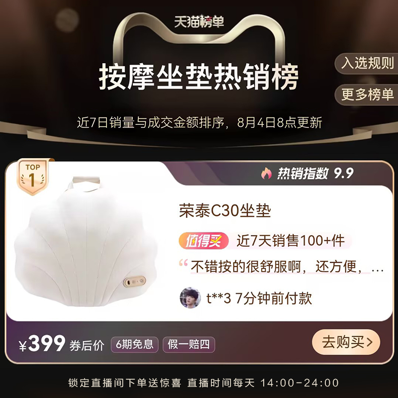 89¥ CZ321 yti3585HQ52¥ https://m.tb.cn/h.isL8iis 【可以躺着按腰】荣泰按摩靠垫腰部按摩器背部按摩仪按摩坐垫C30 --------------------- 【原售价】699元 【现售价】679元。