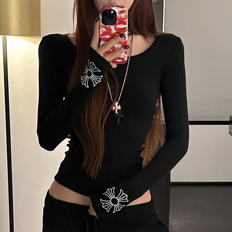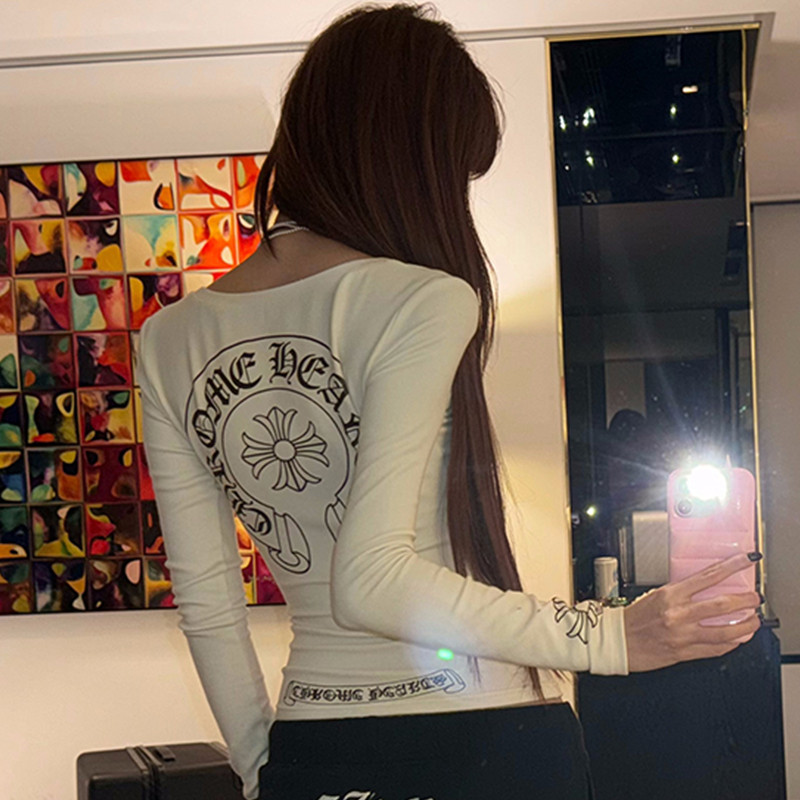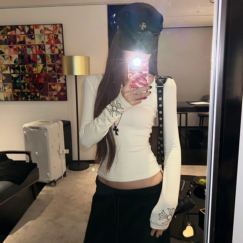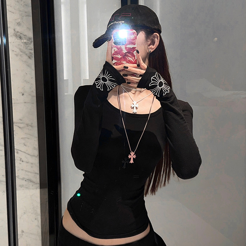 📚 梵文十字架印花磨毛长袖T恤女秋冬小众修身显瘦打底衫纯欲上衣潮