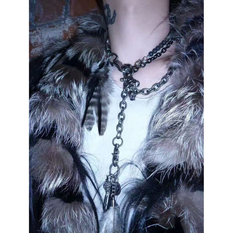 📚 手作视觉系羽毛骷髅十字架多层次复古钥匙扣裤链项链