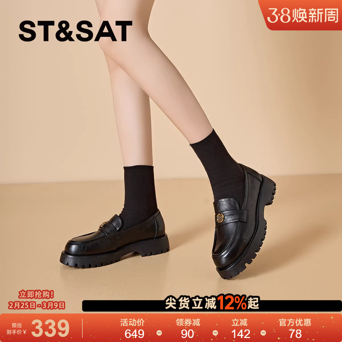📚 星期六真皮乐福鞋女山茶花新款秋季女鞋平底单鞋英伦风黑色小皮鞋