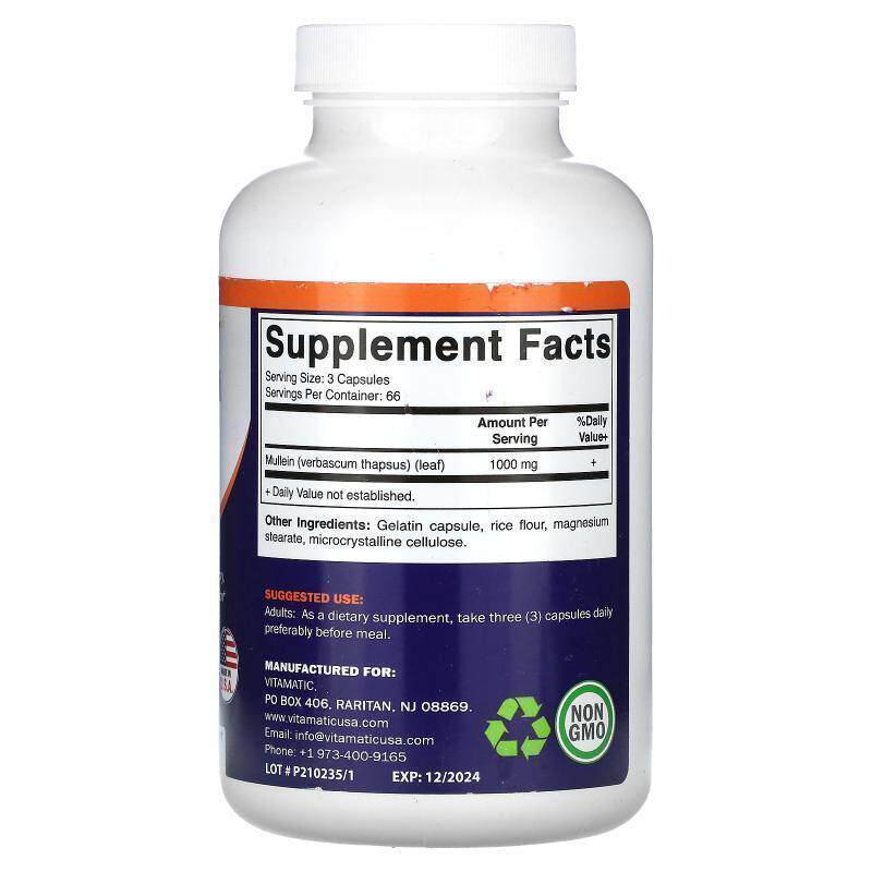 📚 Vitamatic,Mullein Leaf, 333 mg, 200 Capsules