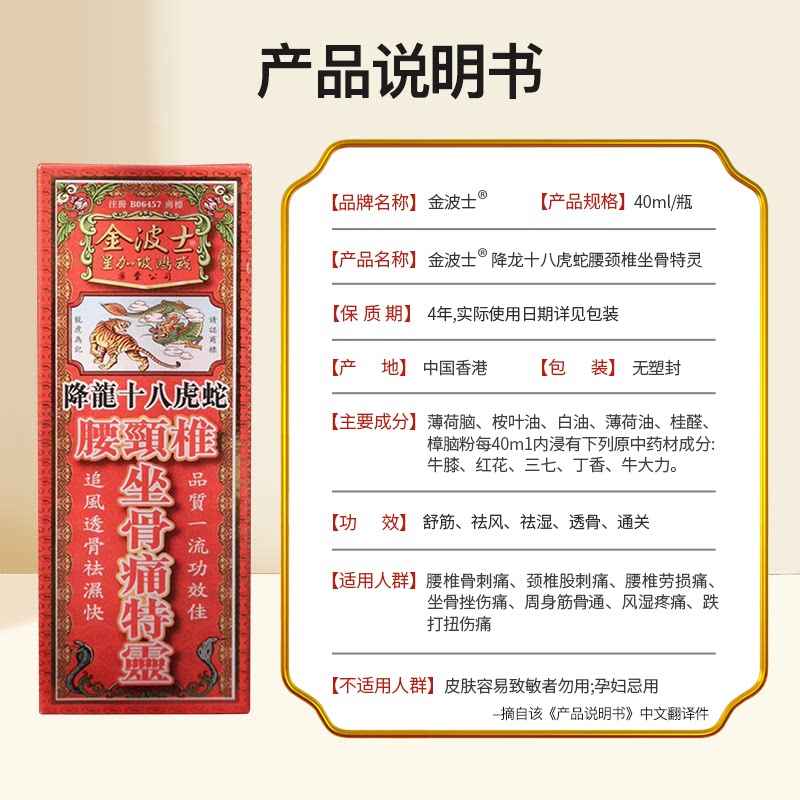📚 金波士降龙十八虎蛇腰颈椎坐骨痛特灵香港原装跌打活络油40ml