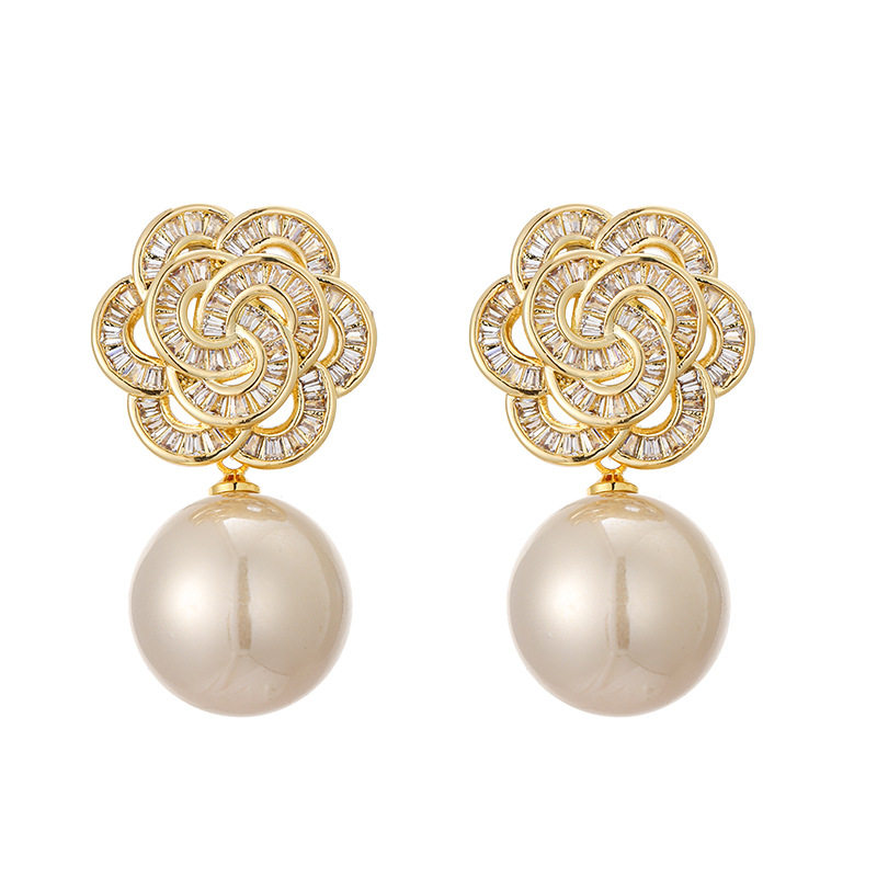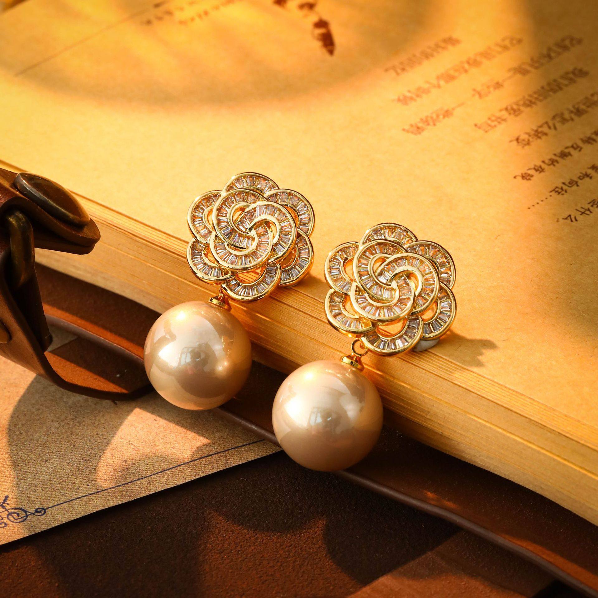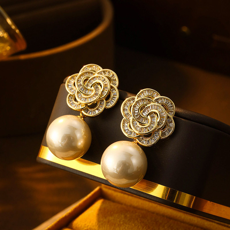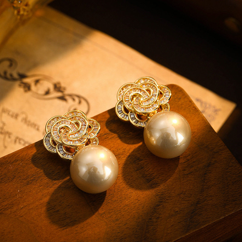 📚 海派镂空满闪亮花朵耳环轻奢复古典名媛珍珠耳钉精致旗袍耳饰品女