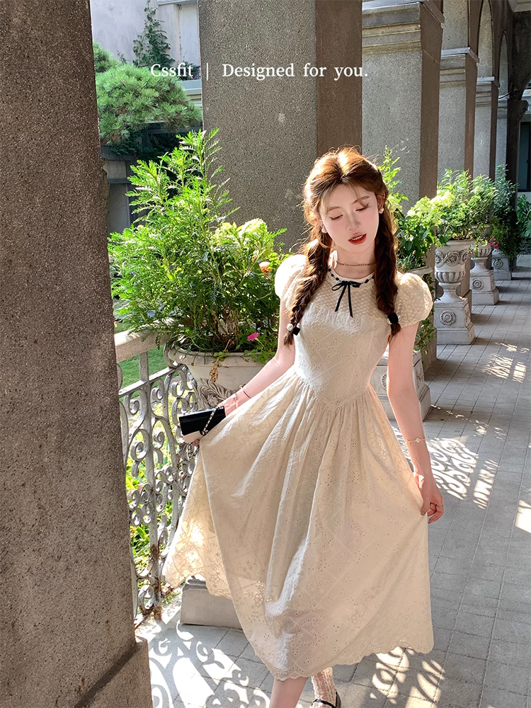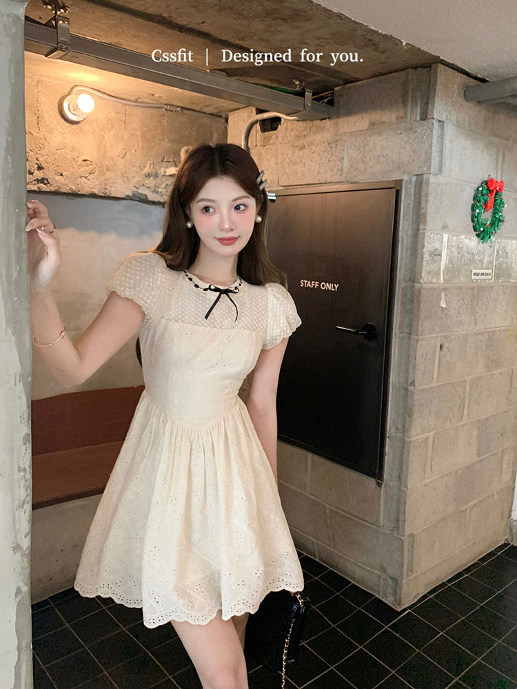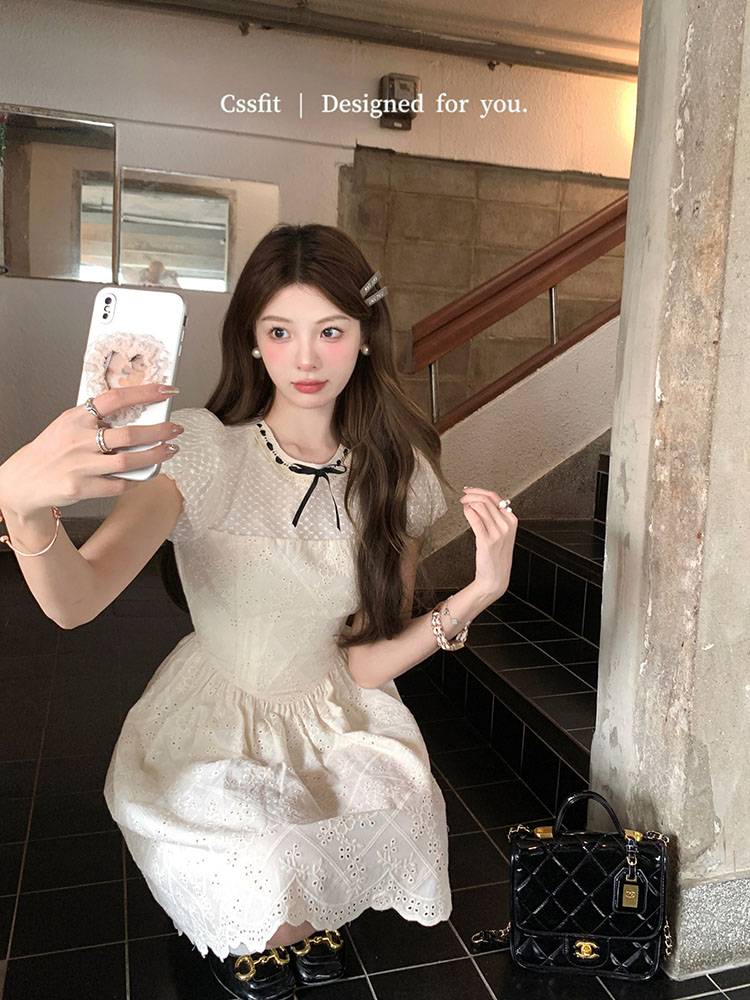 📚 迟伞伞 偷心小执事 法式甜美泡泡袖蝴蝶结拼接刺绣连衣裙女短裙