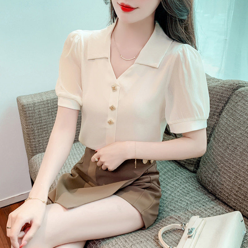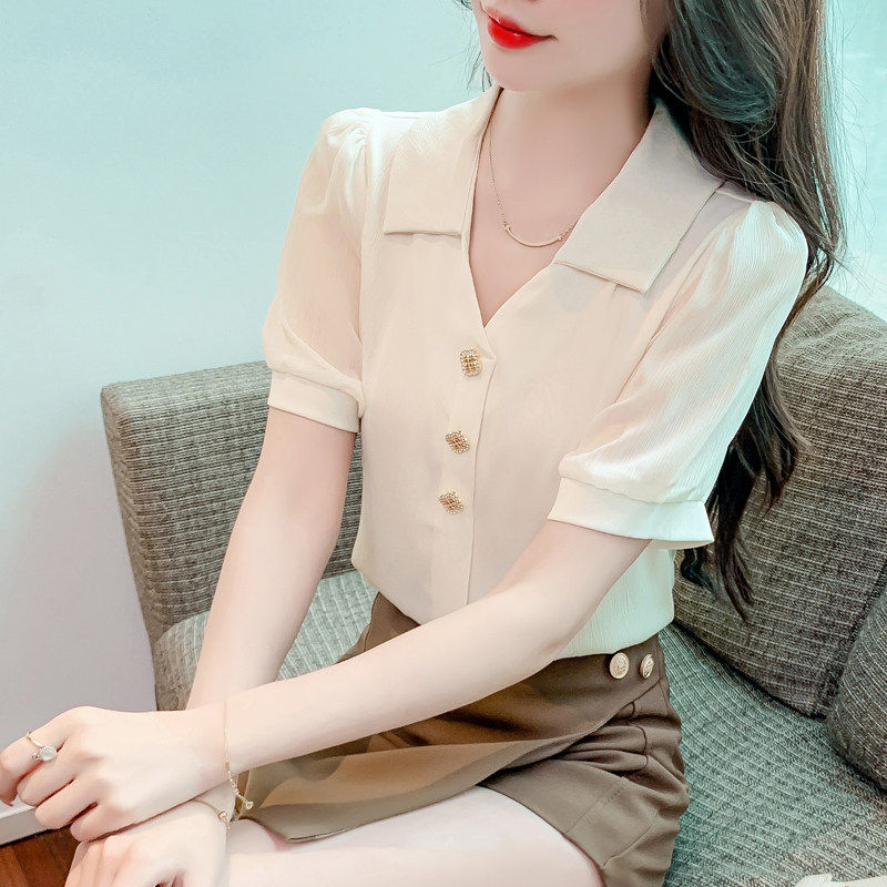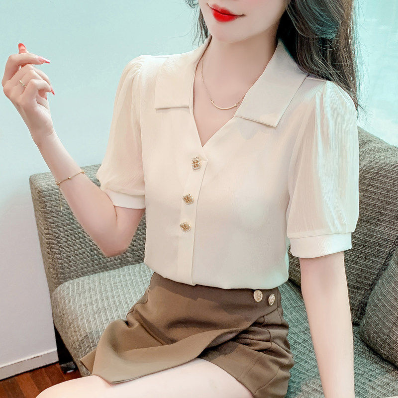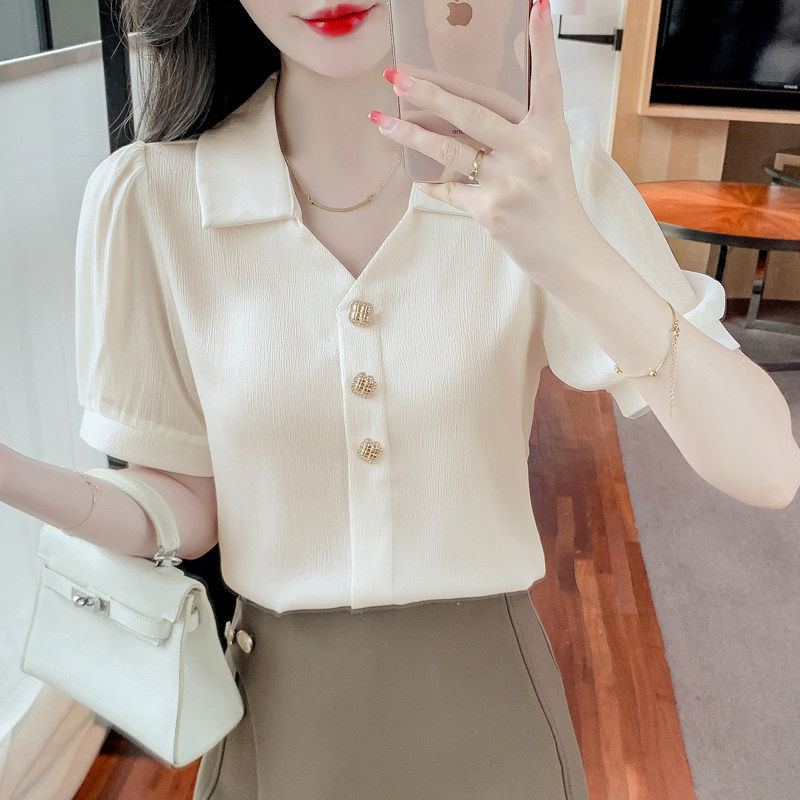📚 150小个子短袖V领雪纺衬衫女夏155穿搭设计感减龄小衫洋气上衣xs
