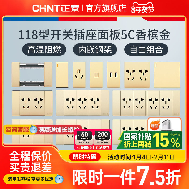 📚 正泰开关插座118型5C金家用墙面5五孔二三插16a电源带usb插孔面板