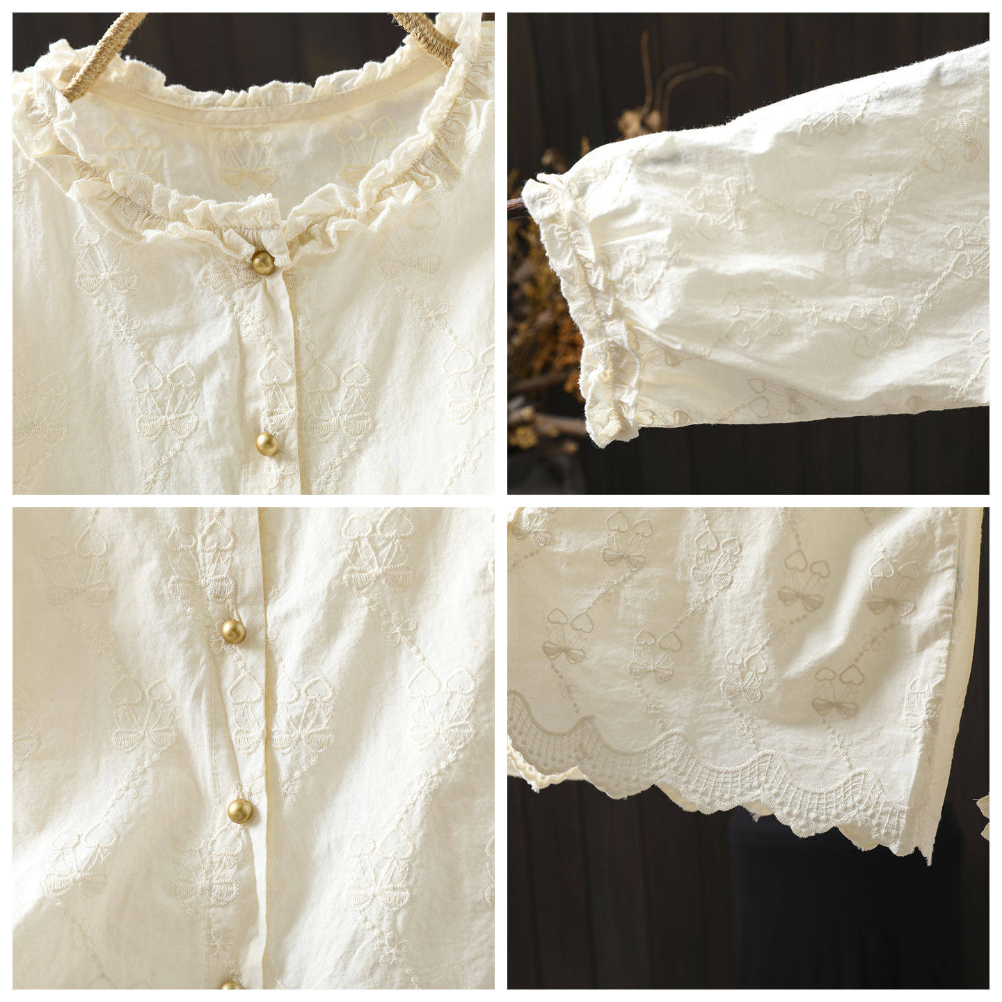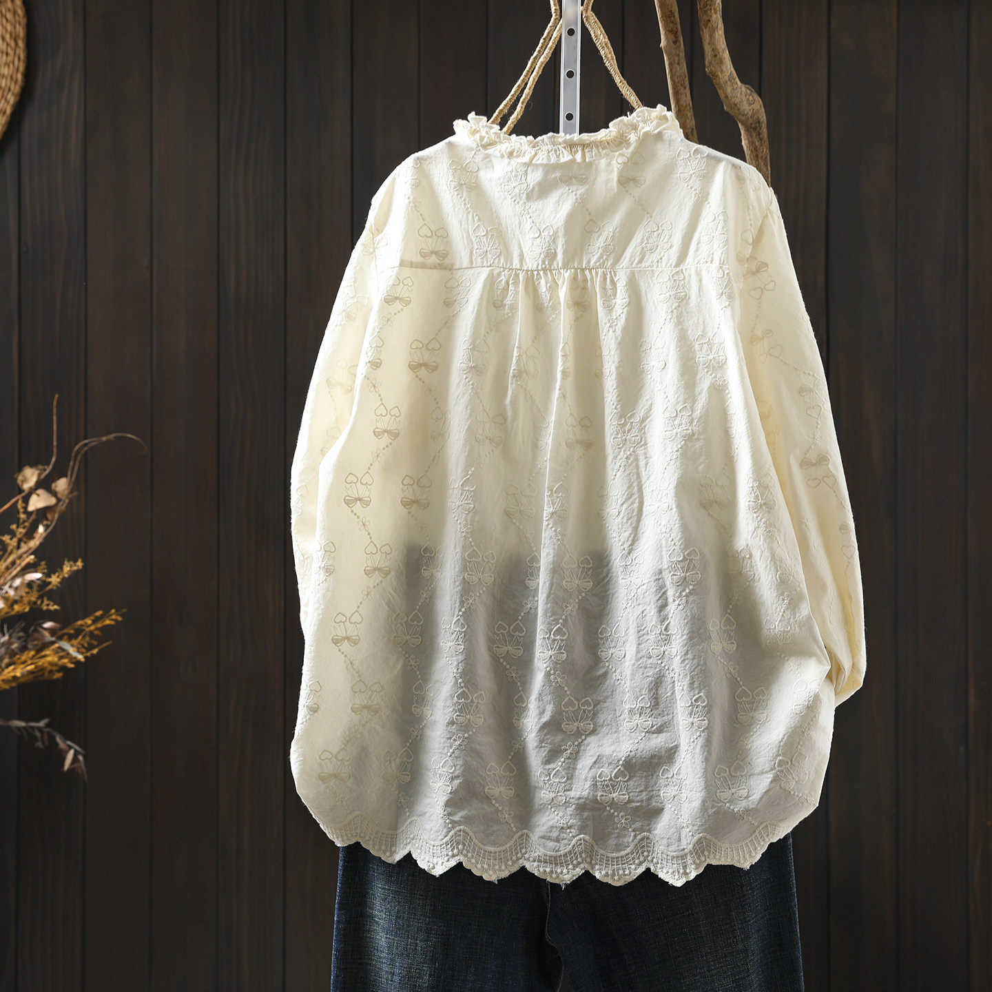 📚 法式小资小上衣女2026新款春装季纯棉刺绣木耳花边领减龄文艺衬衫