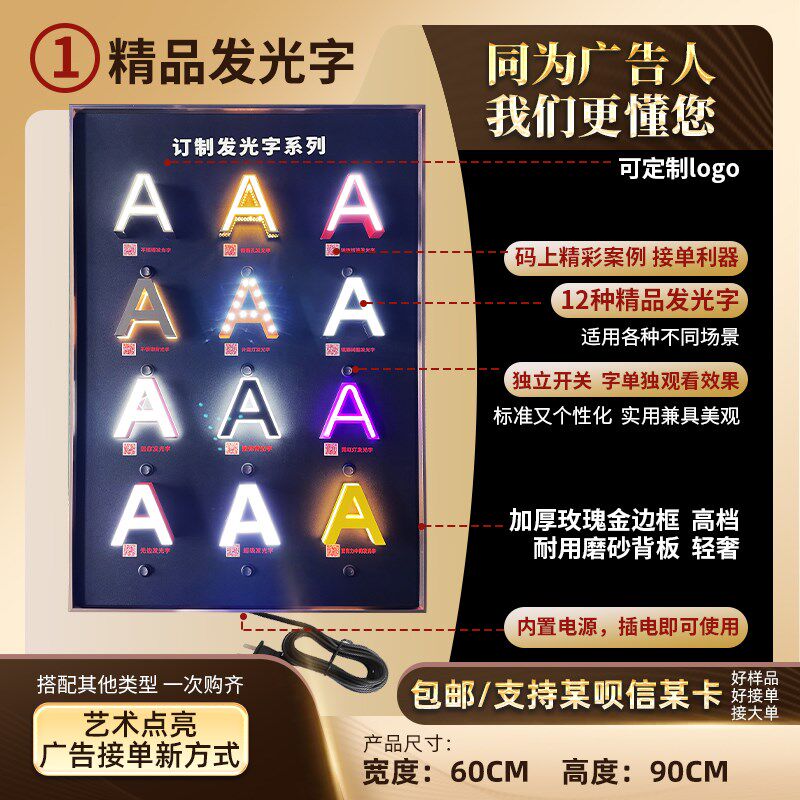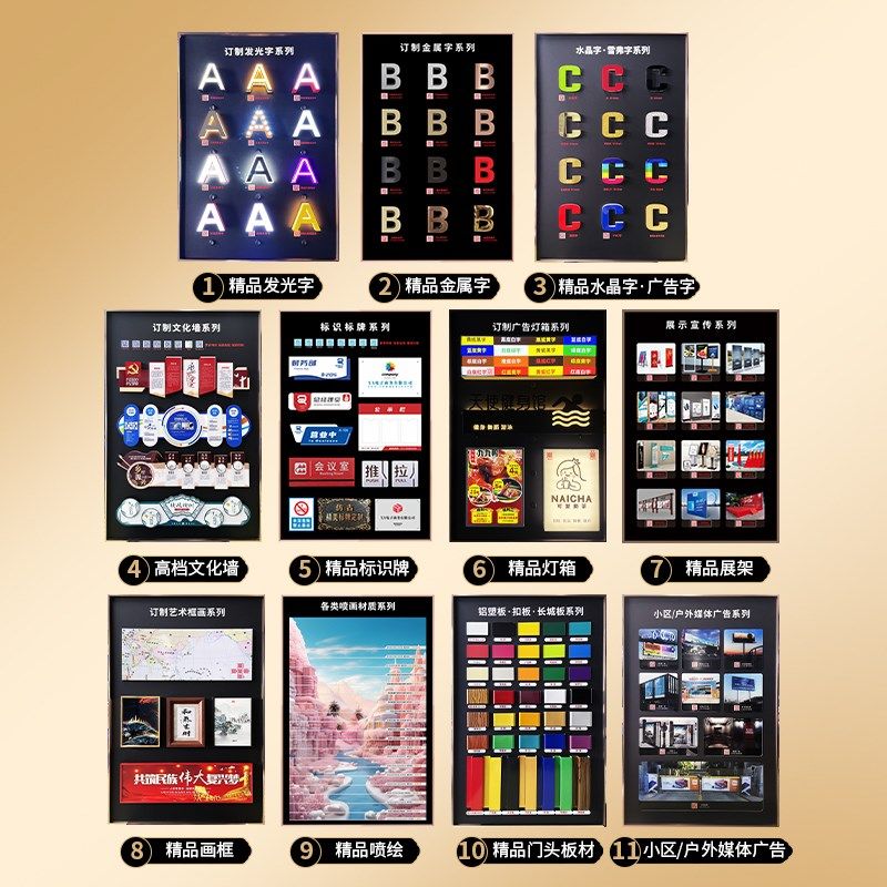 📚 广告样品展示墙图文快印广告装饰公司发光字样品展板架文化墙展板
