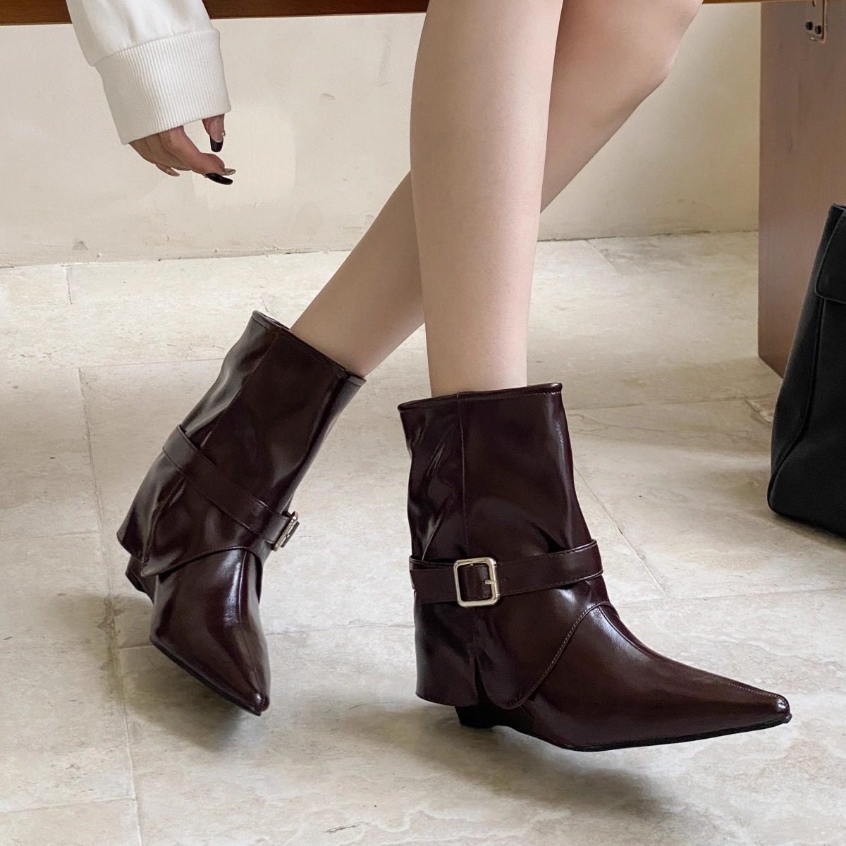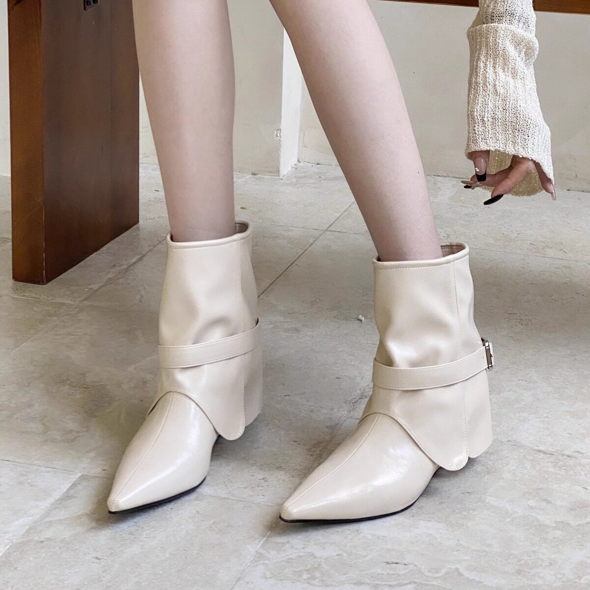 📚 2025秋冬新款尖头粗跟短筒靴女时尚百搭裤管靴皮带扣短靴瘦瘦靴潮