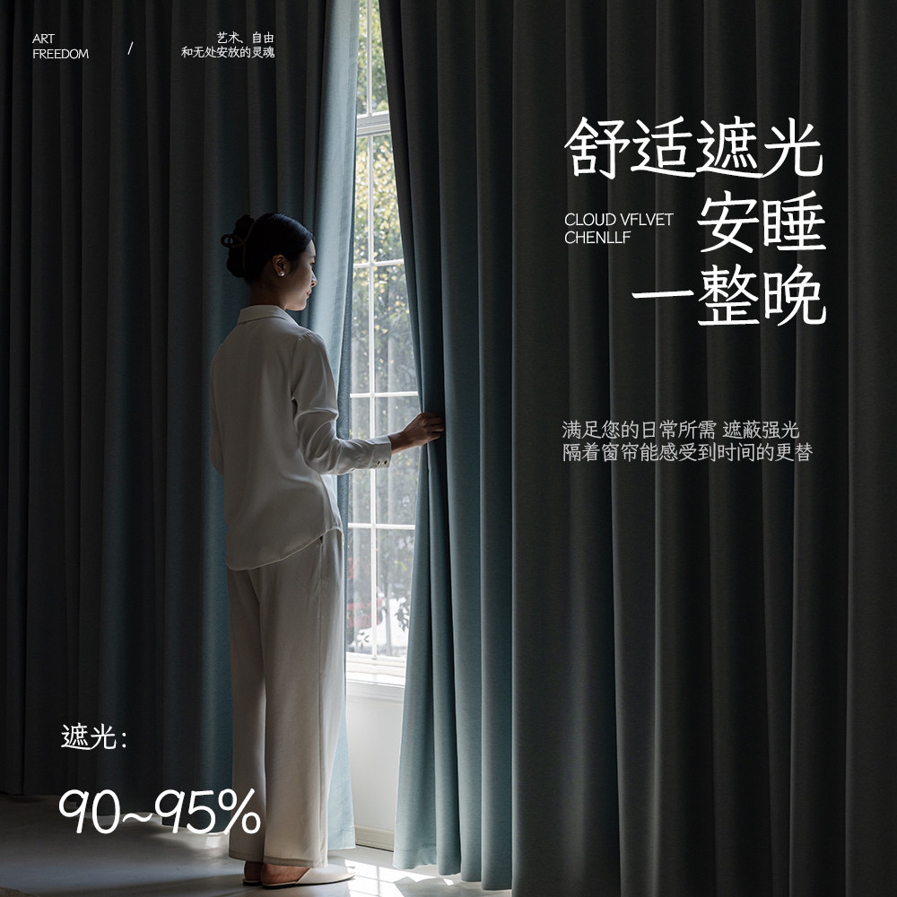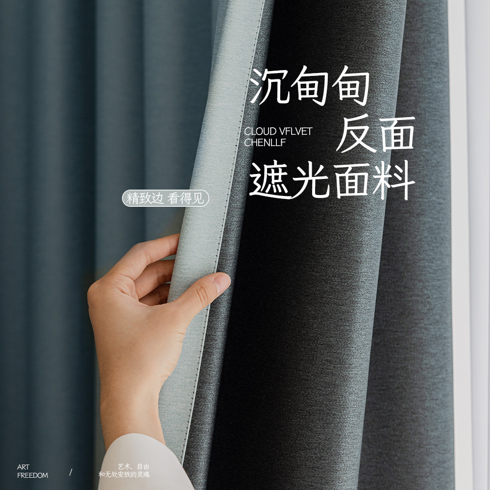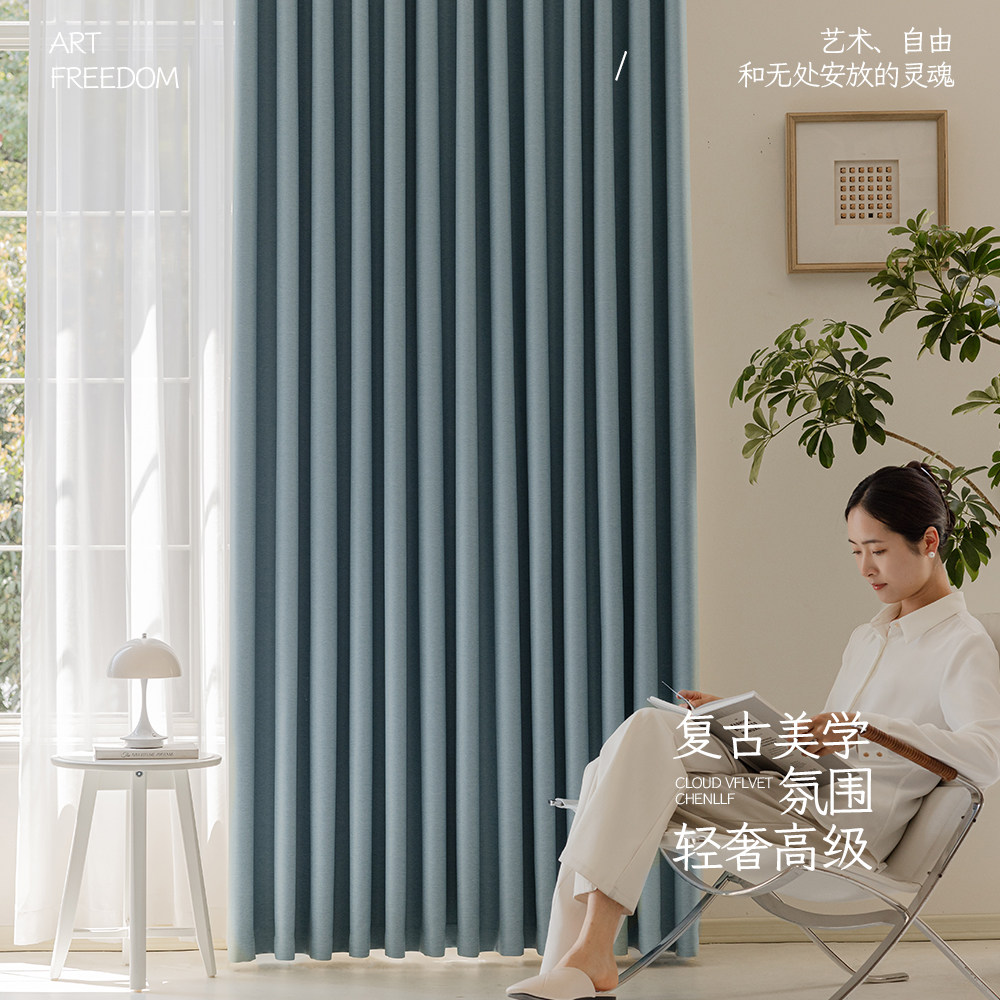 📚 现代简约轻奢门帘柯桥窗帘遮光定制2025年新款极简青蓝色卧室客厅