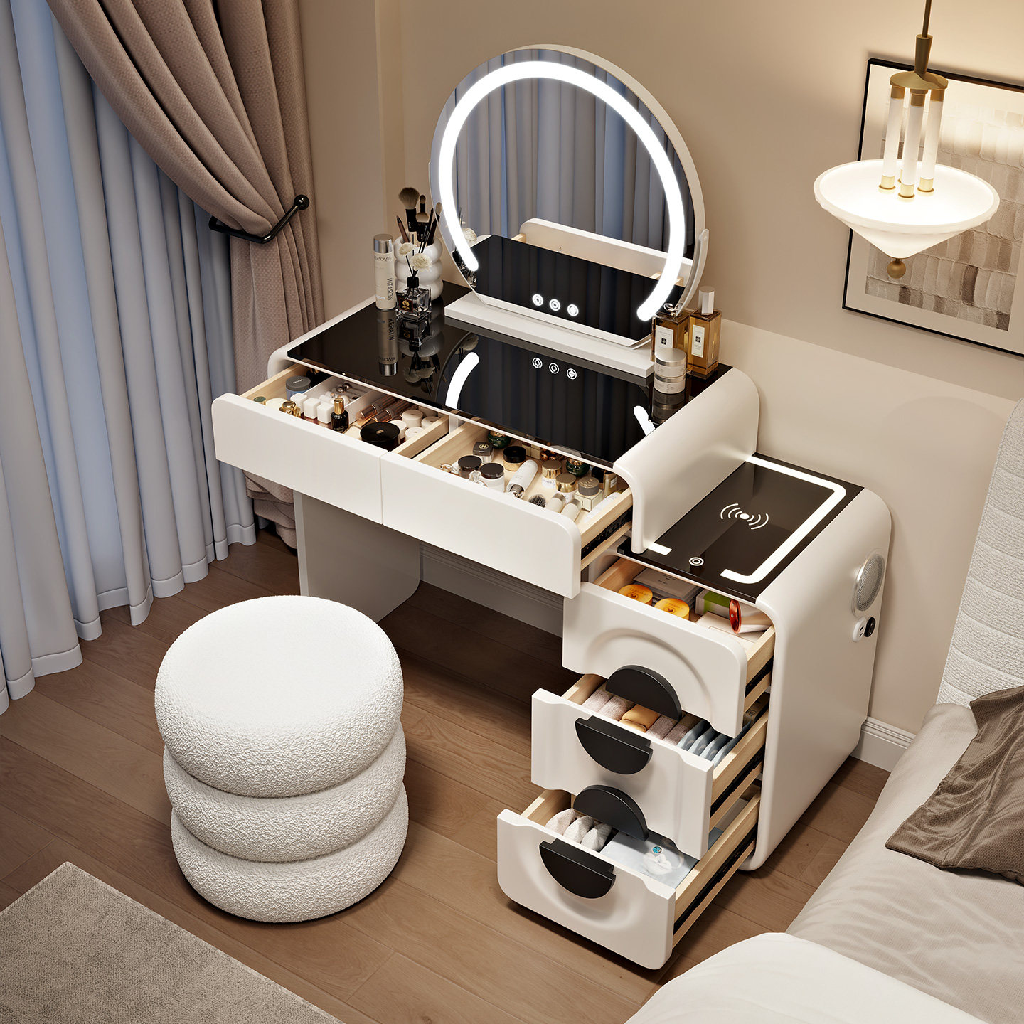 💪这款化妆台的功能齐全,适合各种化妆需求。一体化的设计,让化妆过程更加便捷高效。斗柜式的收纳设计,让你的化妆品一应俱全,轻松满足你的日常需求。简约而不失高级感,让你在繁忙的生活中也能保持精致。