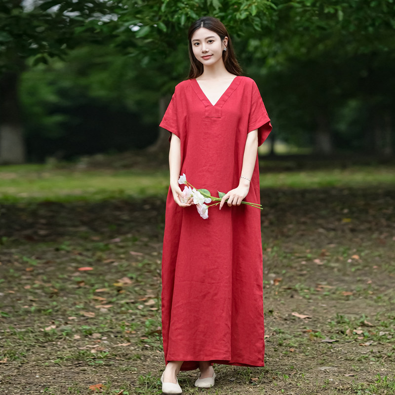 📚 自制!显肤白!原创高档砂洗纯亚麻文艺简约袍子连衣裙女夏款宽松