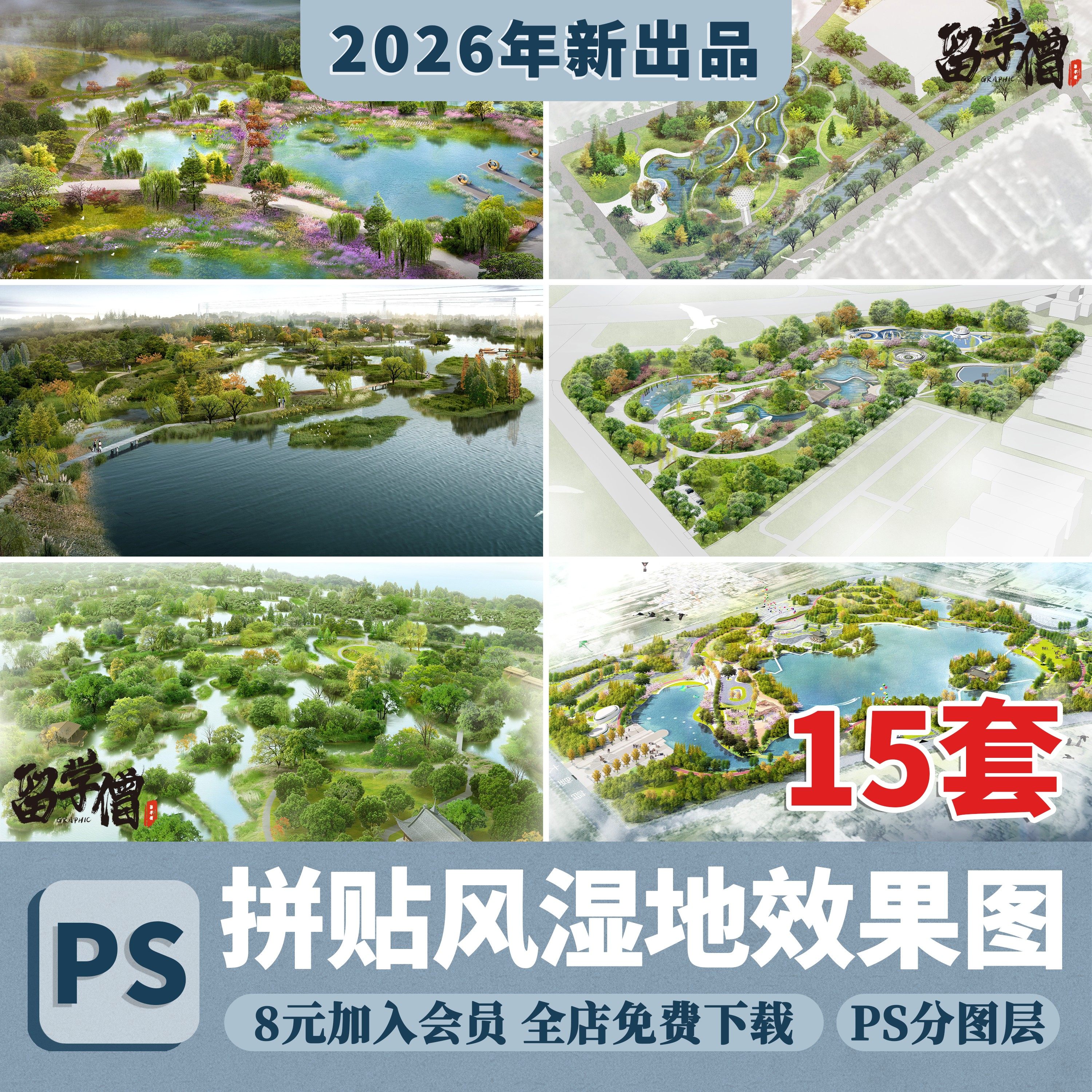 📚 2026竞赛拼贴风湿地公园psd效果图灰调拼贴鸟瞰图效果图psd源文件