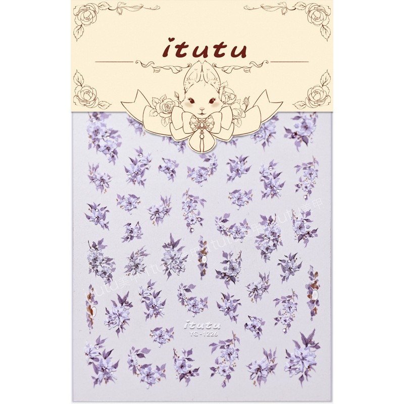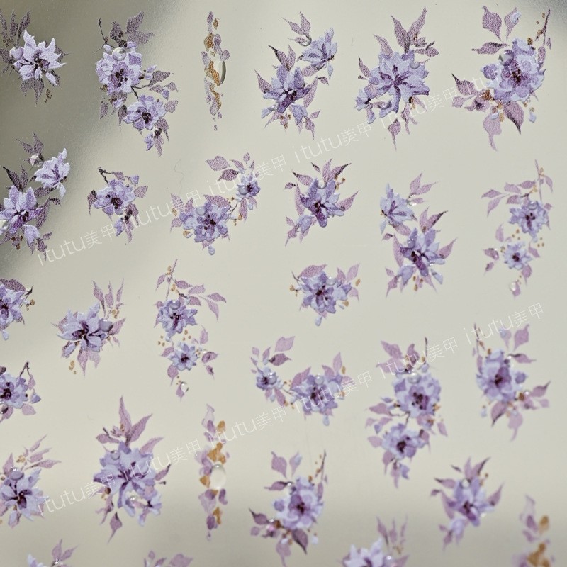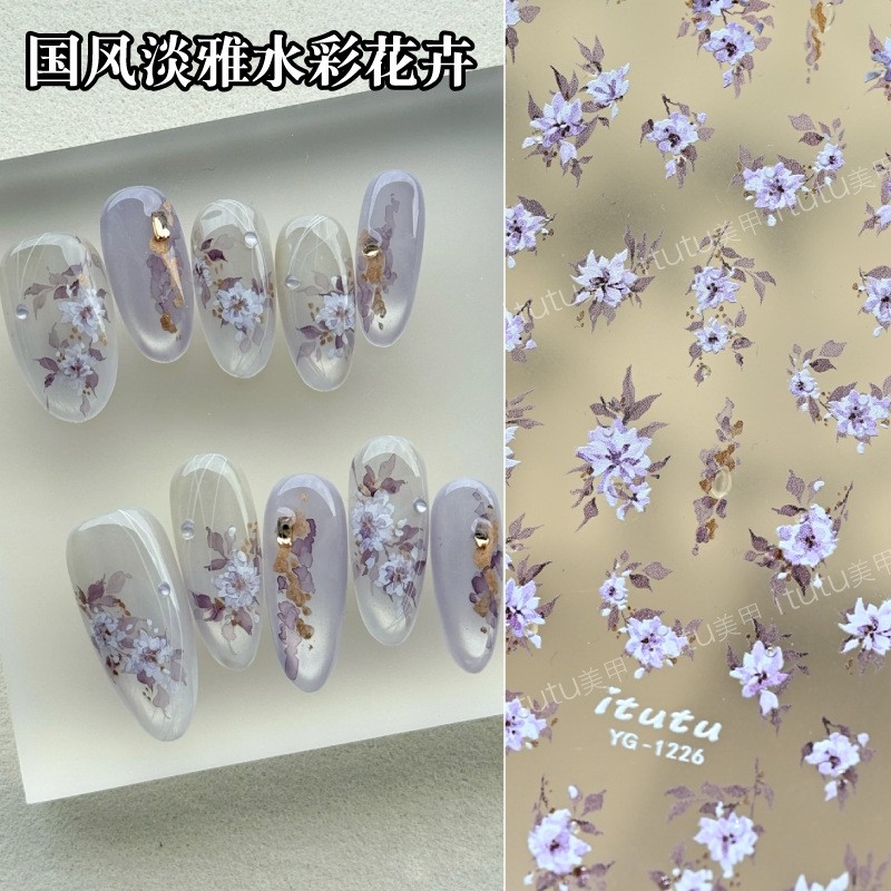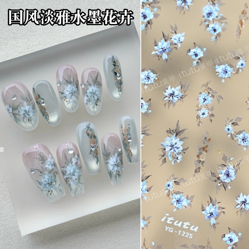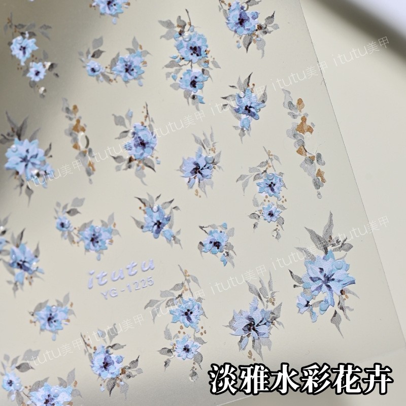 📚 网红款淡雅水彩花卉浮雕美甲贴纸新国风水墨花朵浅蓝小花指甲贴纸