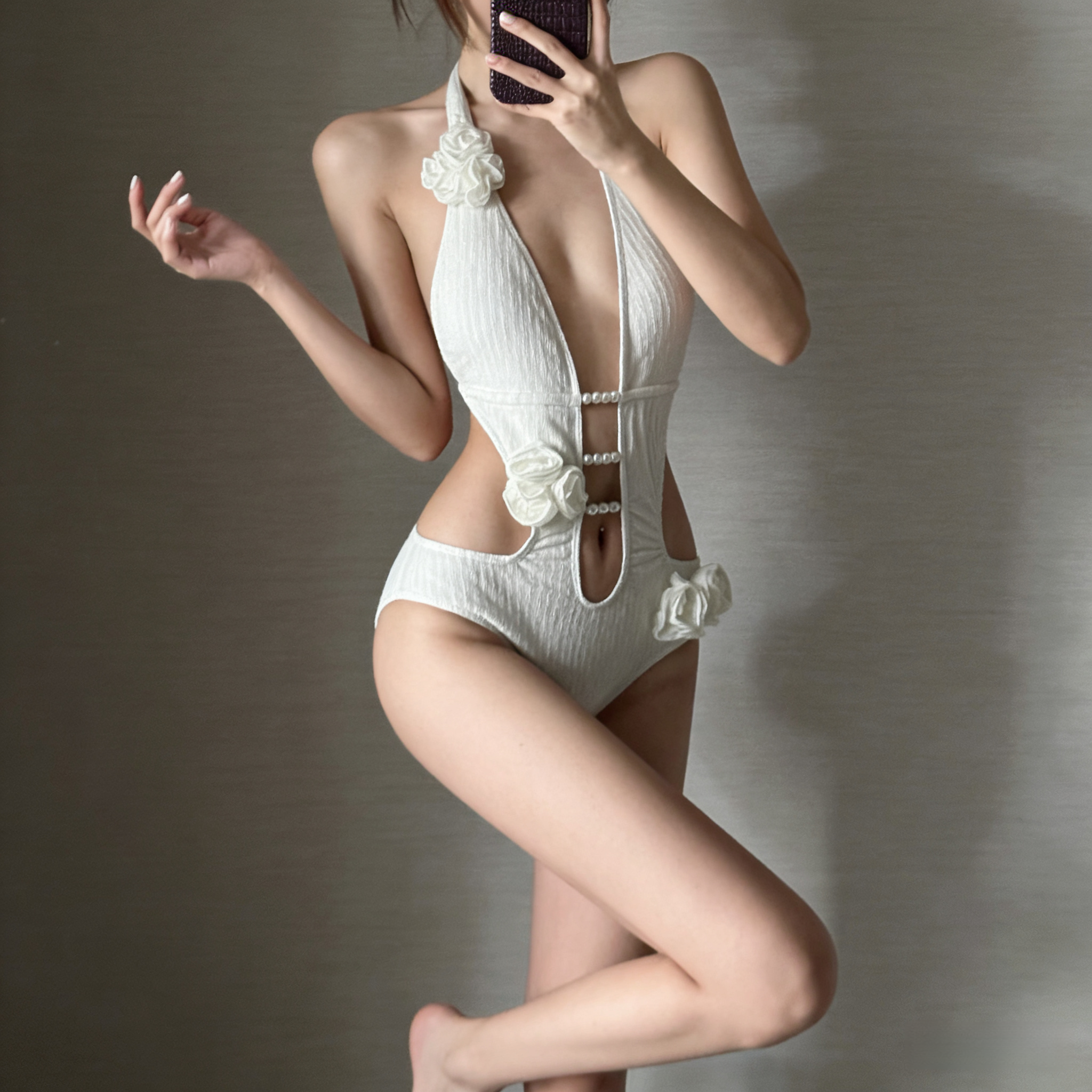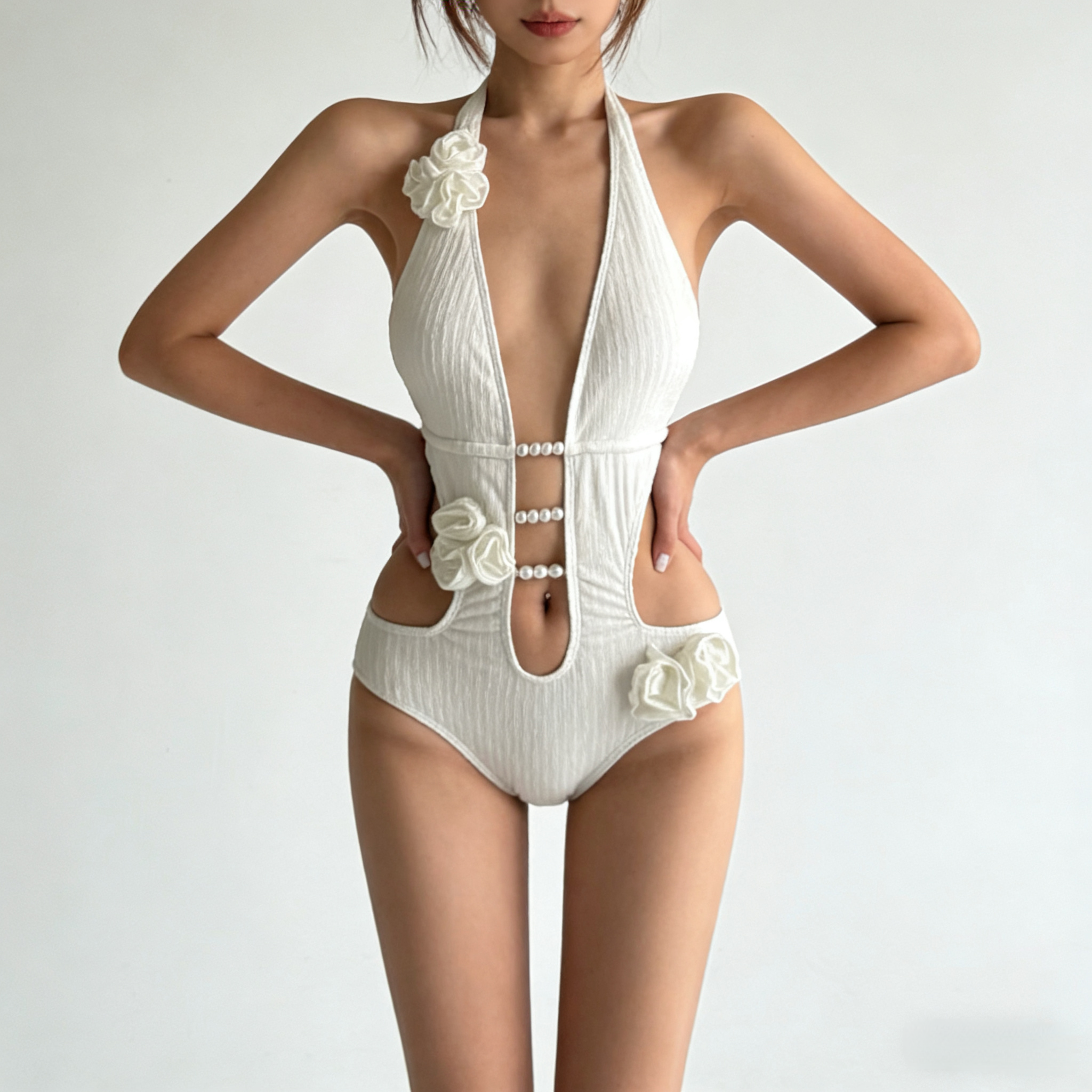 📚 欧美泰国风沙漏腰连体泳衣女手工花朵镂空高级感辣妹度假新款泳装