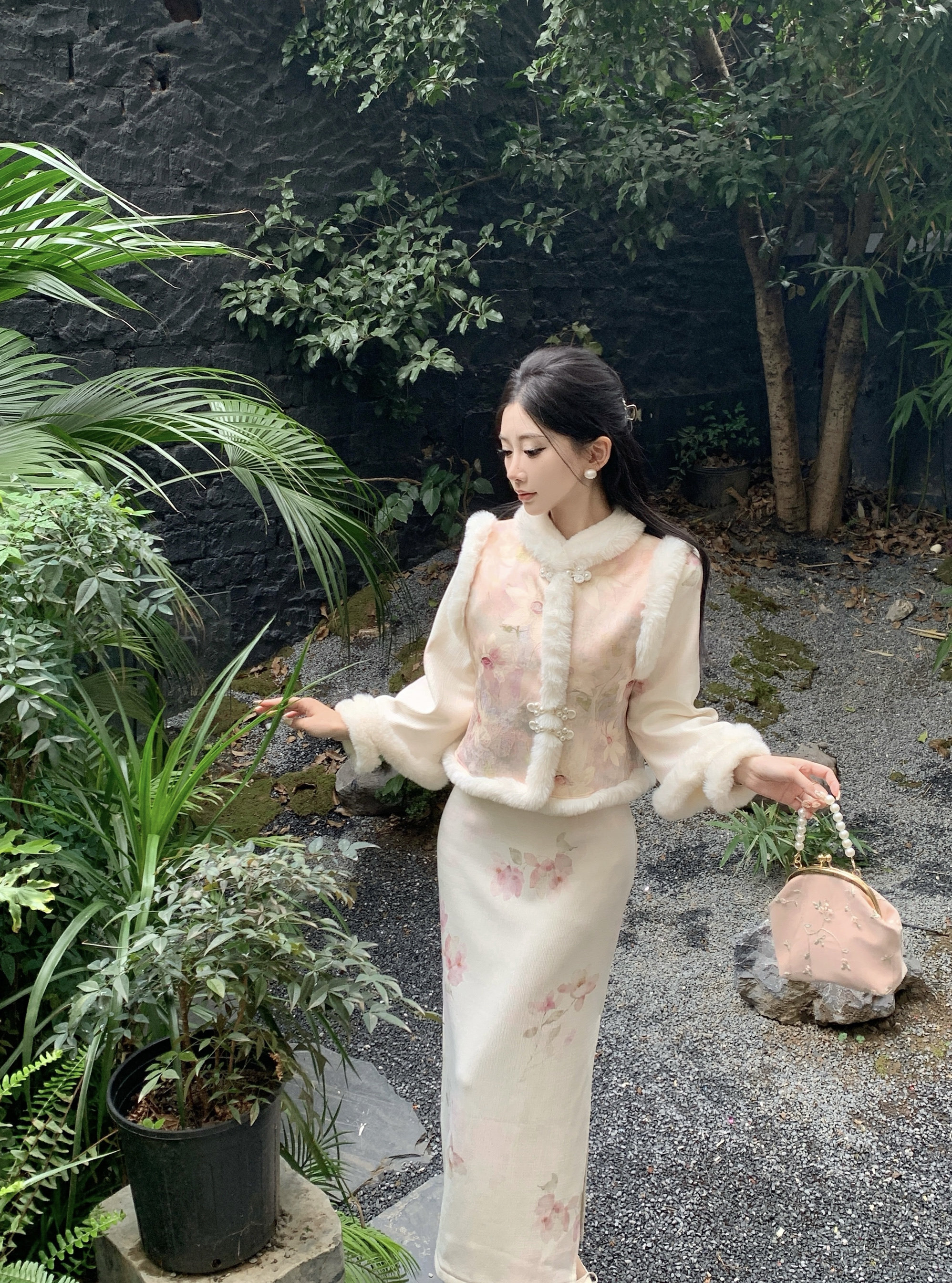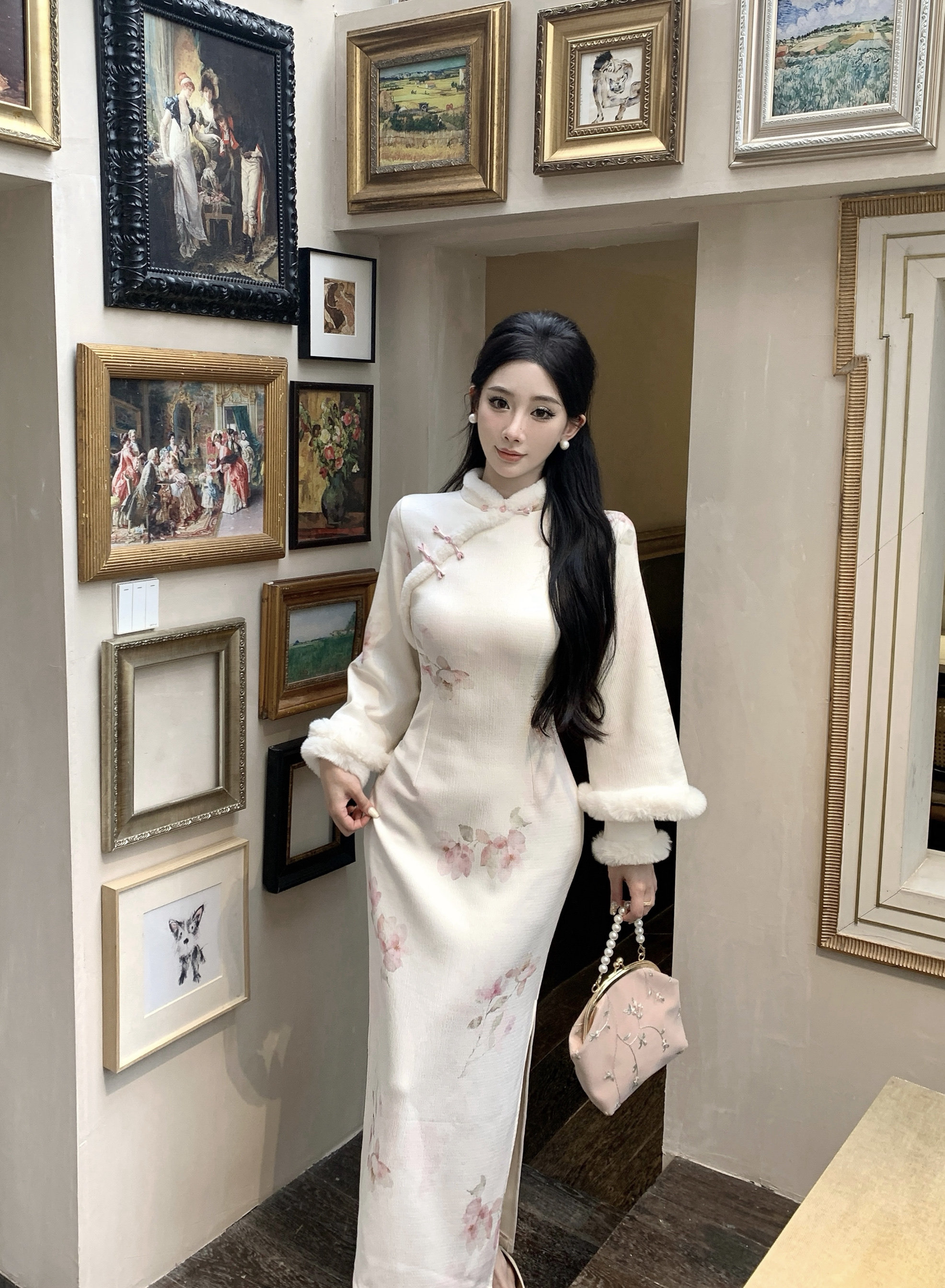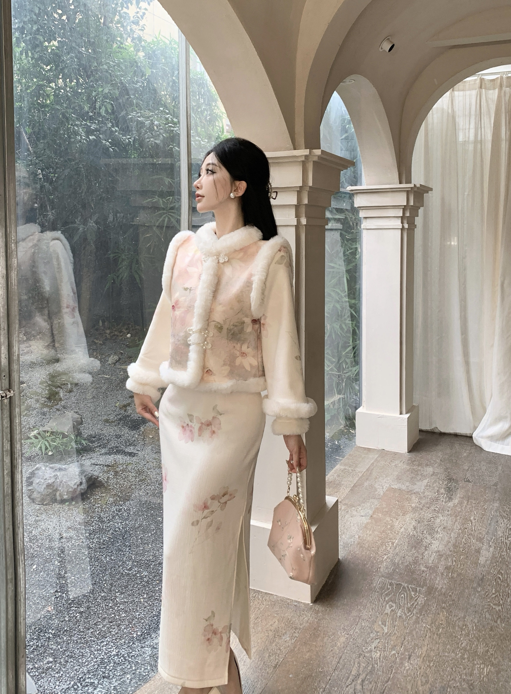 📚 新中式温柔设计感毛领盘扣马甲旗袍连衣裙女2025冬季国风气质套装