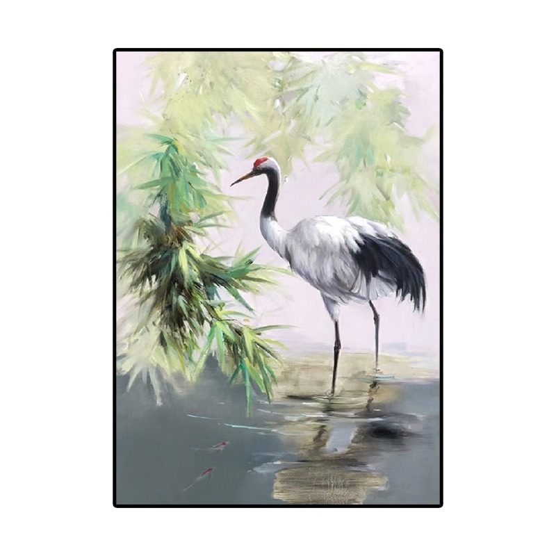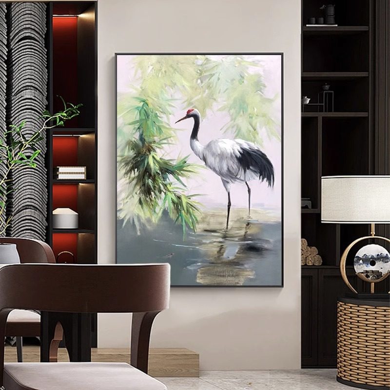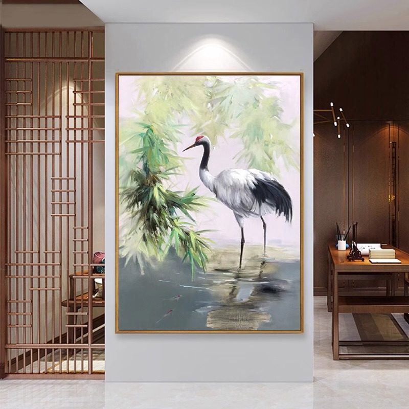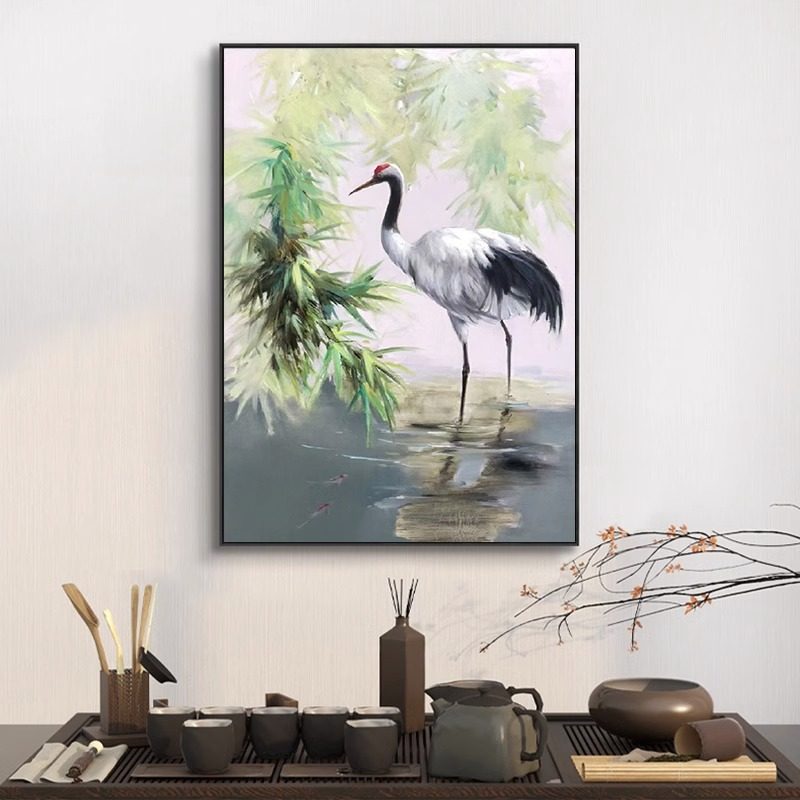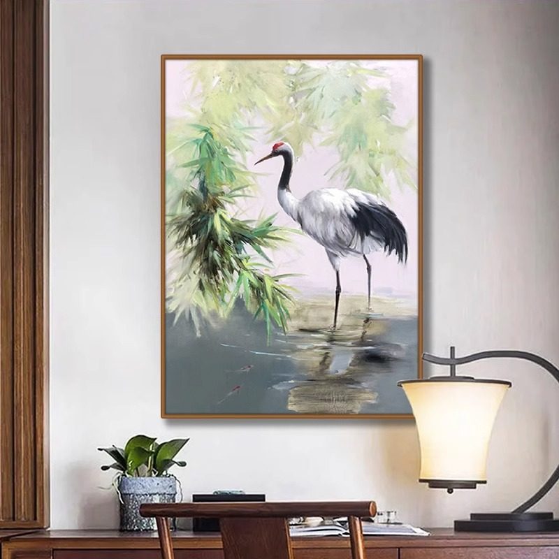 📚 新中式仙鹤手绘油画书房竹子装饰画简约客厅玄关丹顶鹤动物挂画
