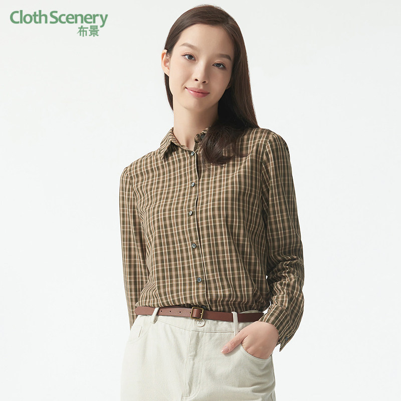 📚 布景衬衫女春季商场同款复古文艺格纹翻领长袖莱赛尔格子衬衣0109