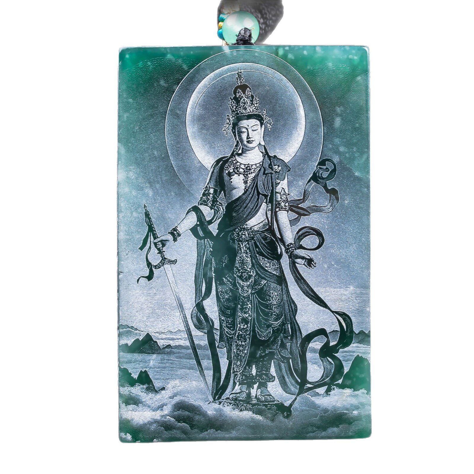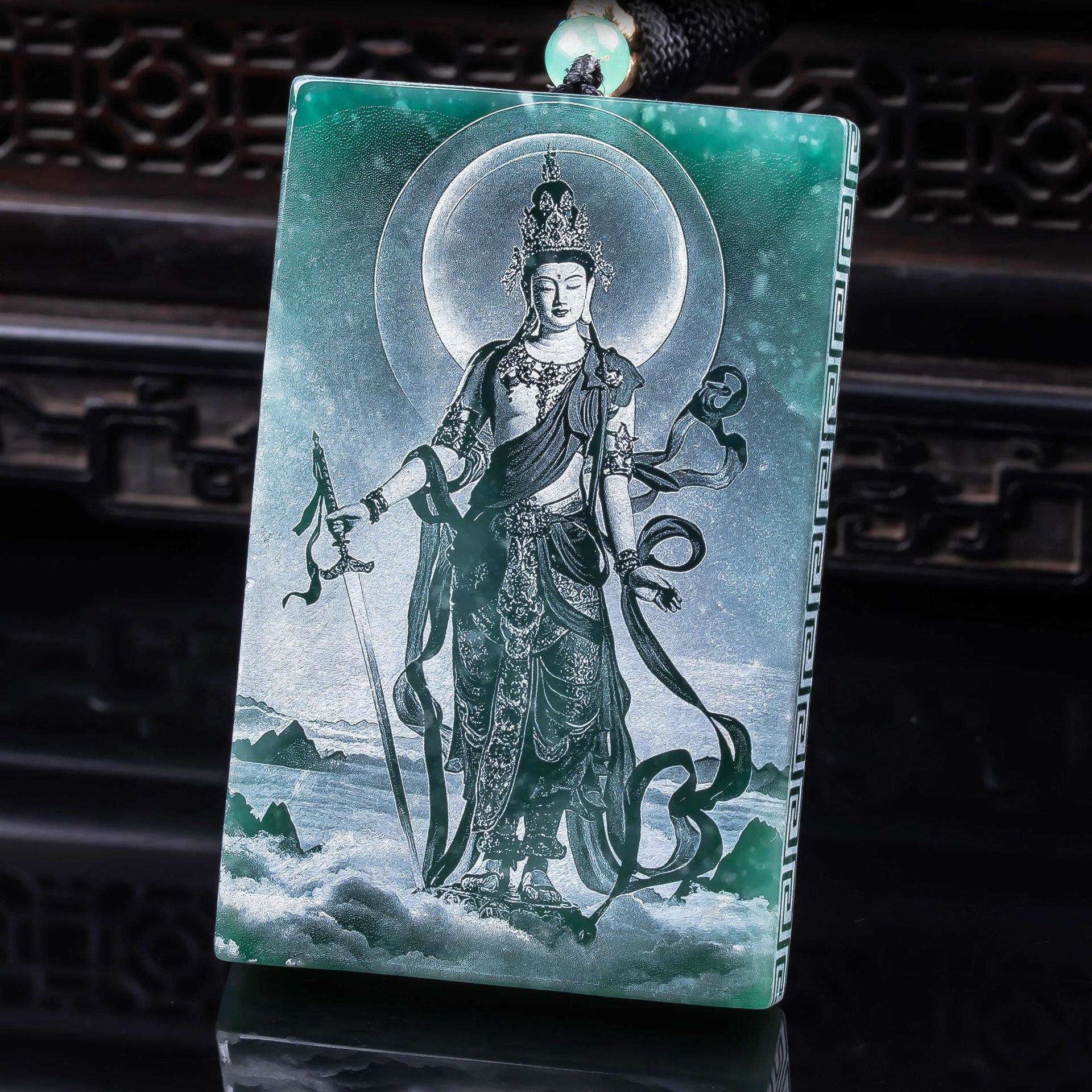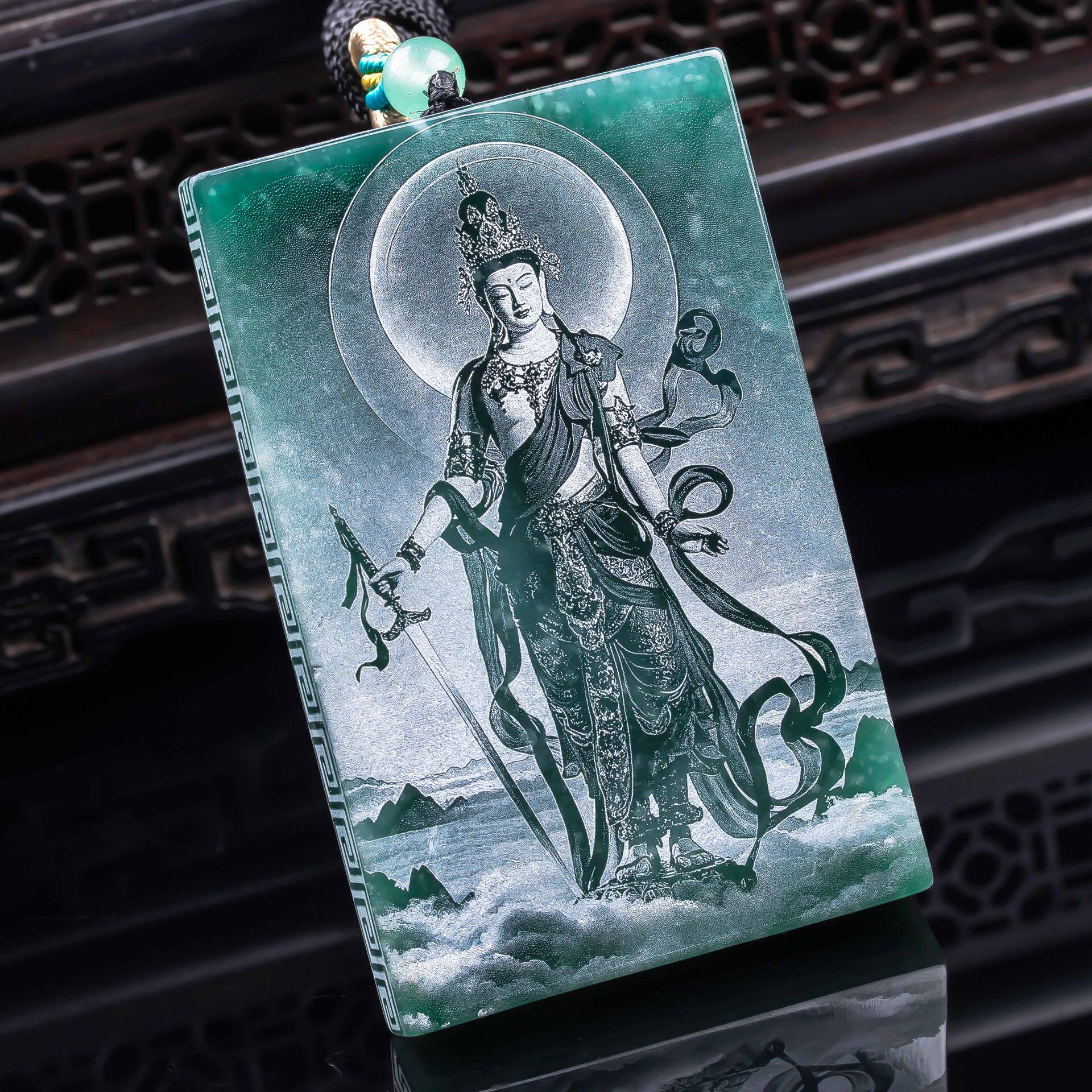 📚 天然A货翡翠文殊菩萨蓝水双面精工影雕高冰玉石吊坠挂件玉佩玉美