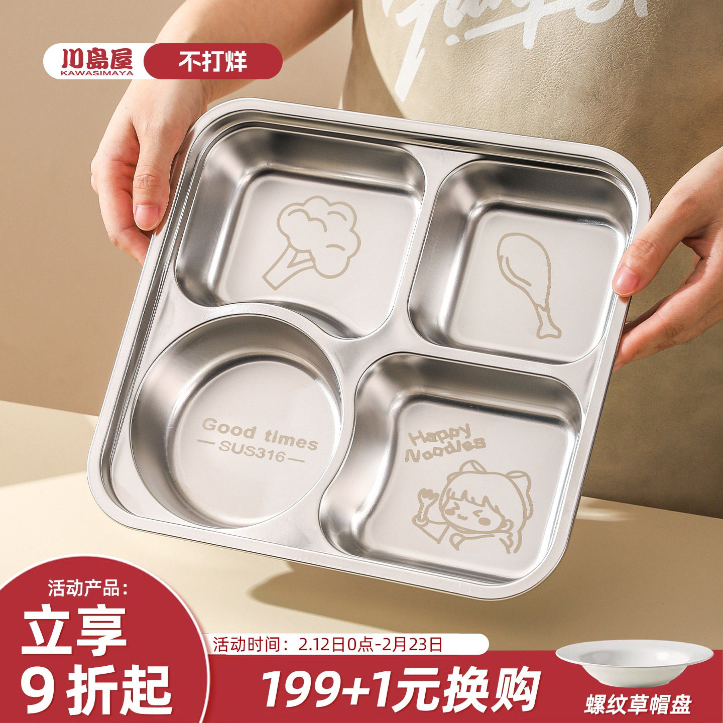 📚 川岛屋儿童分格餐盘食品级316不锈钢304幼儿园宝宝四格分隔早餐盘