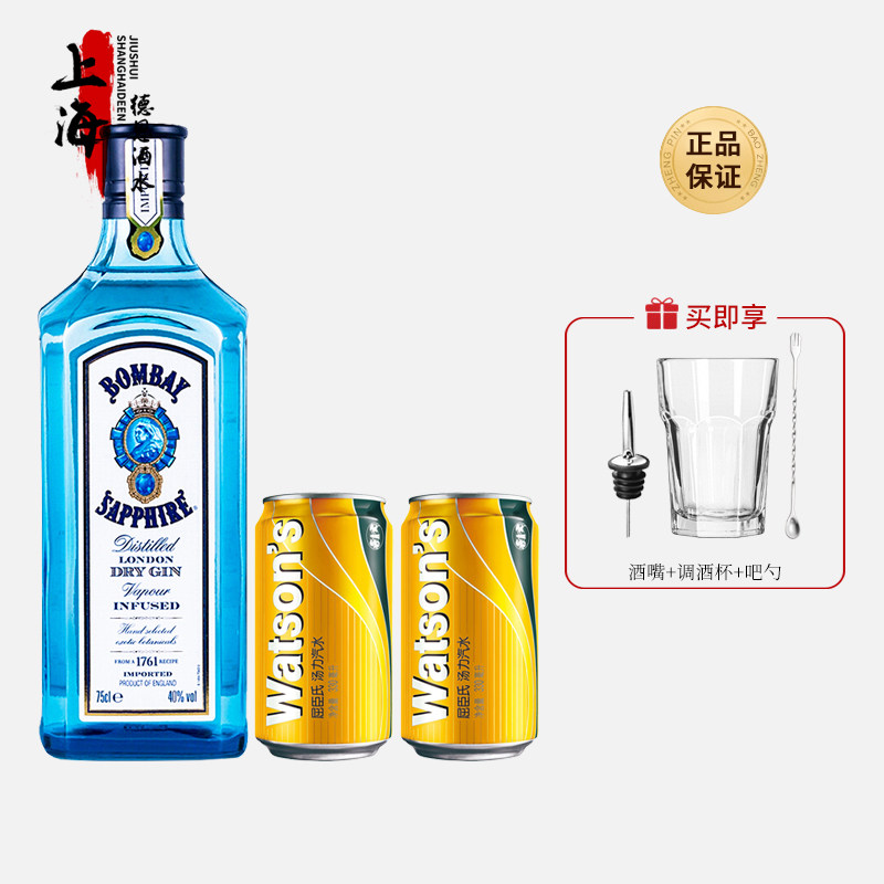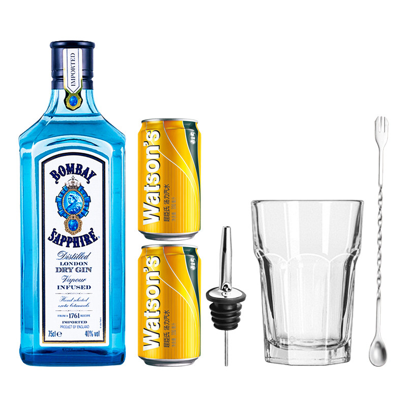 📚 金汤力!孟买 蓝宝石金酒750ml+屈臣氏汤力水2听鸡尾酒调基酒套餐