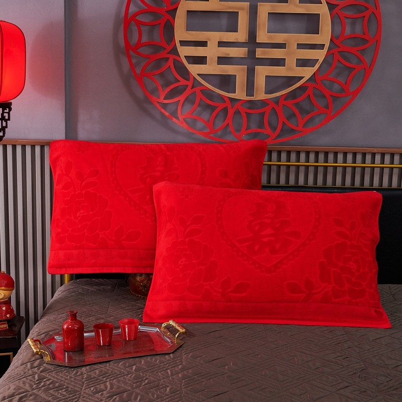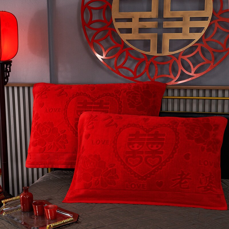 📚 结婚喜庆大红色全棉割绒枕巾一对装婚庆新娘陪嫁枕垫新婚礼物情侣