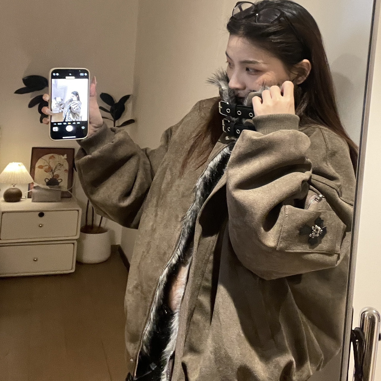 📚 美拉德美式复古棕色毛领座山雕棉服女冬季加厚高级感保暖夹克外套