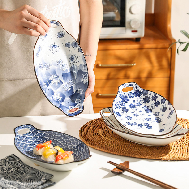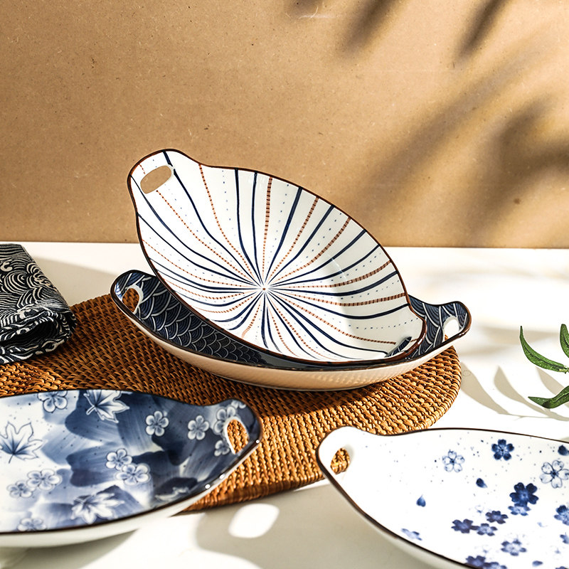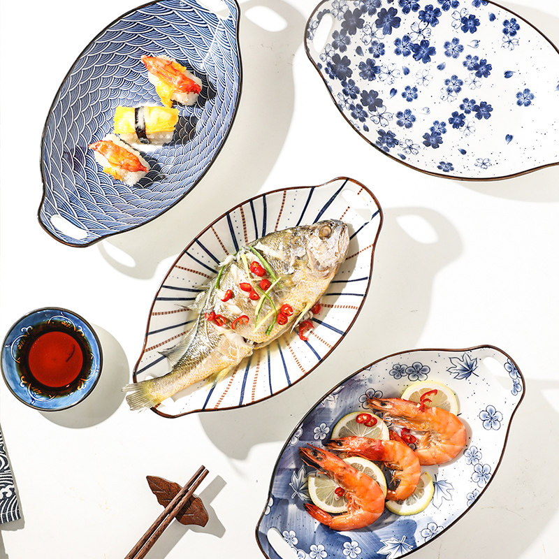 📚 舍里日式鱼盘家用蒸鱼盘子高级感椭圆形菜盘耐高温陶瓷装鱼双耳盘