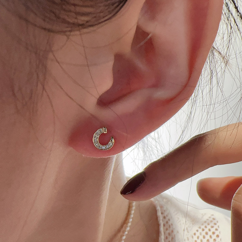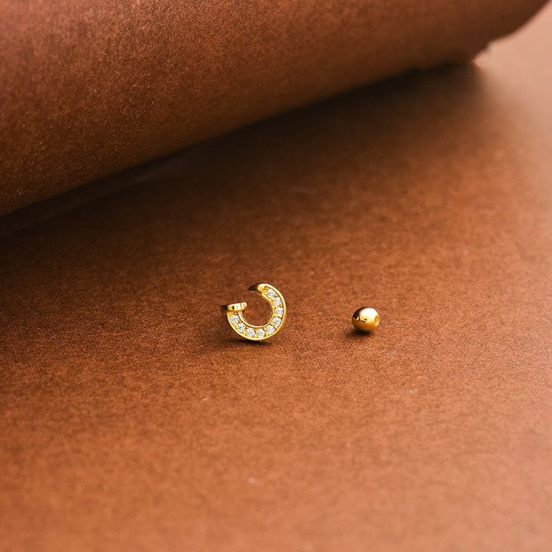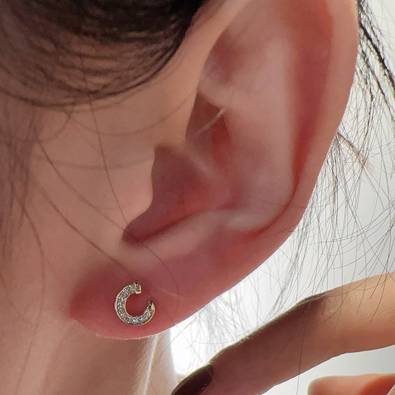 📚 韩国10K黄金耳钉女 镶钻弯钩马蹄螺纹耳饰通体K金睡觉不用摘单只