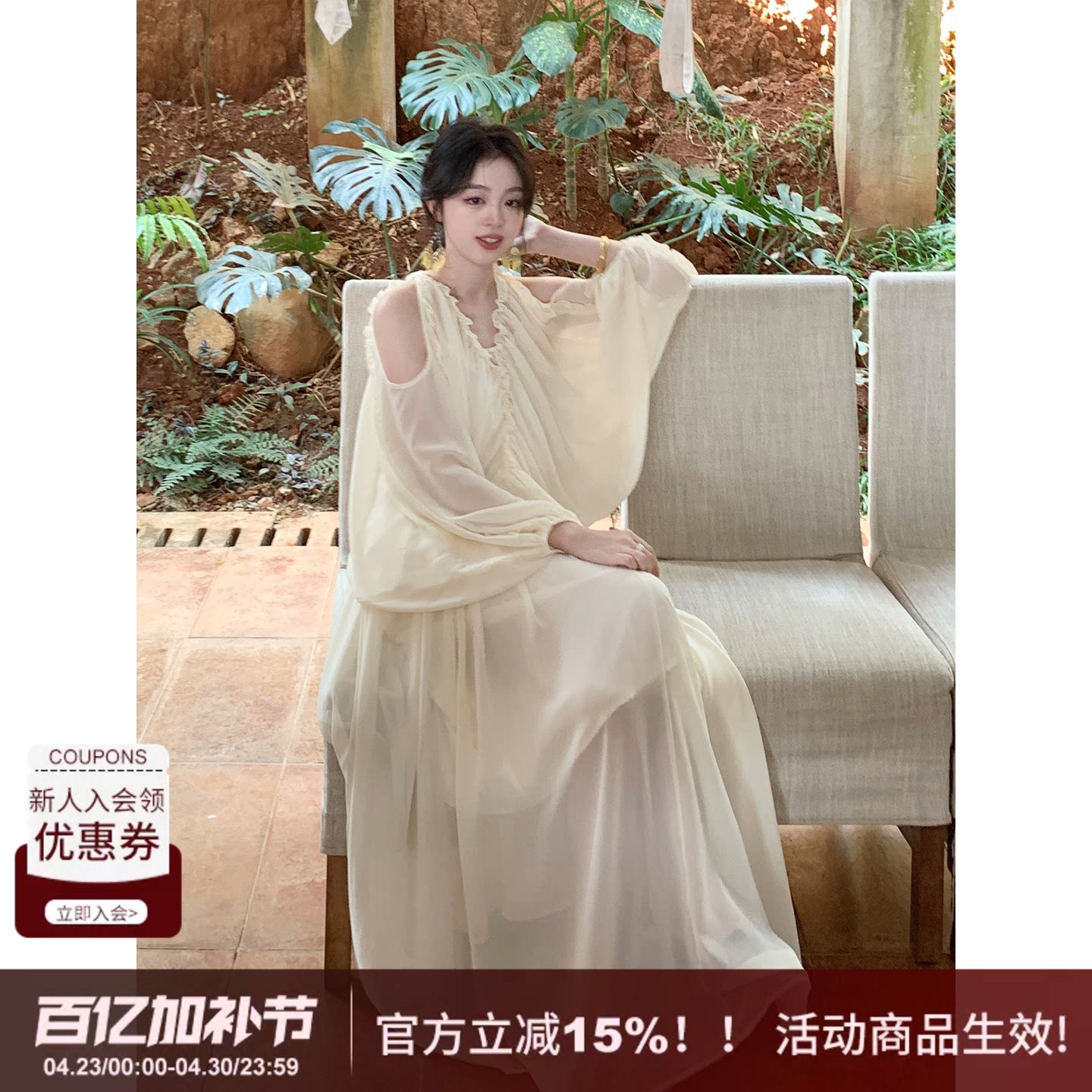 📚 【水云间】SYT自制 度假风露肩木耳边V领仙气飘飘蝙蝠袖连衣裙女