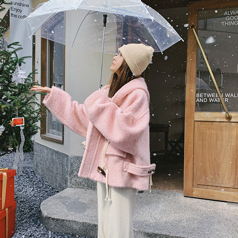 📚 粉色连帽毛呢外套女2025年冬季新款小个子加厚短款呢子牛角扣大衣