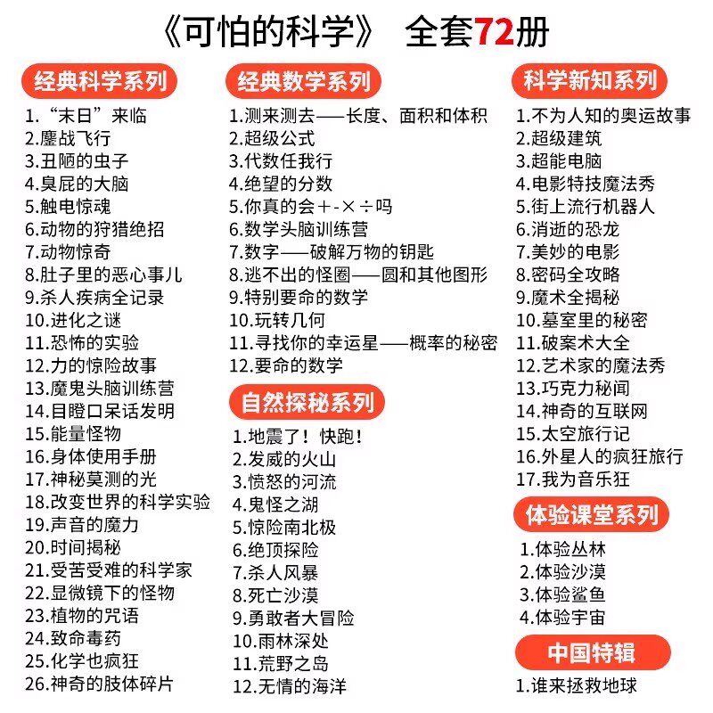 89¥ HU006 uJLpUnrRf6o¥ https://m.tb.cn/h.7CcSiLu 可怕的科学全72册经典数学系列特别要命的逻辑思维漫画科学9-12-14岁儿童图书中小学课外阅读书籍改变科普发明破案大冒险实验植物 --------------------- 【原售价】33元 【现售价】22元。