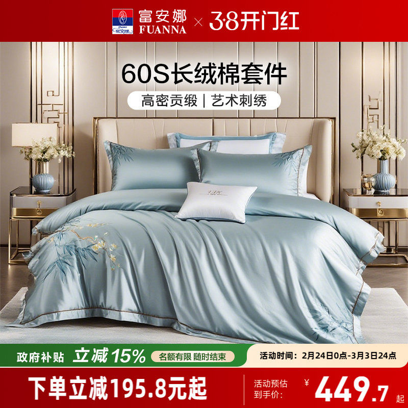 📚 富安娜60支长绒棉四件套高级感纯棉床单被套贡缎床笠轻奢床上用品
