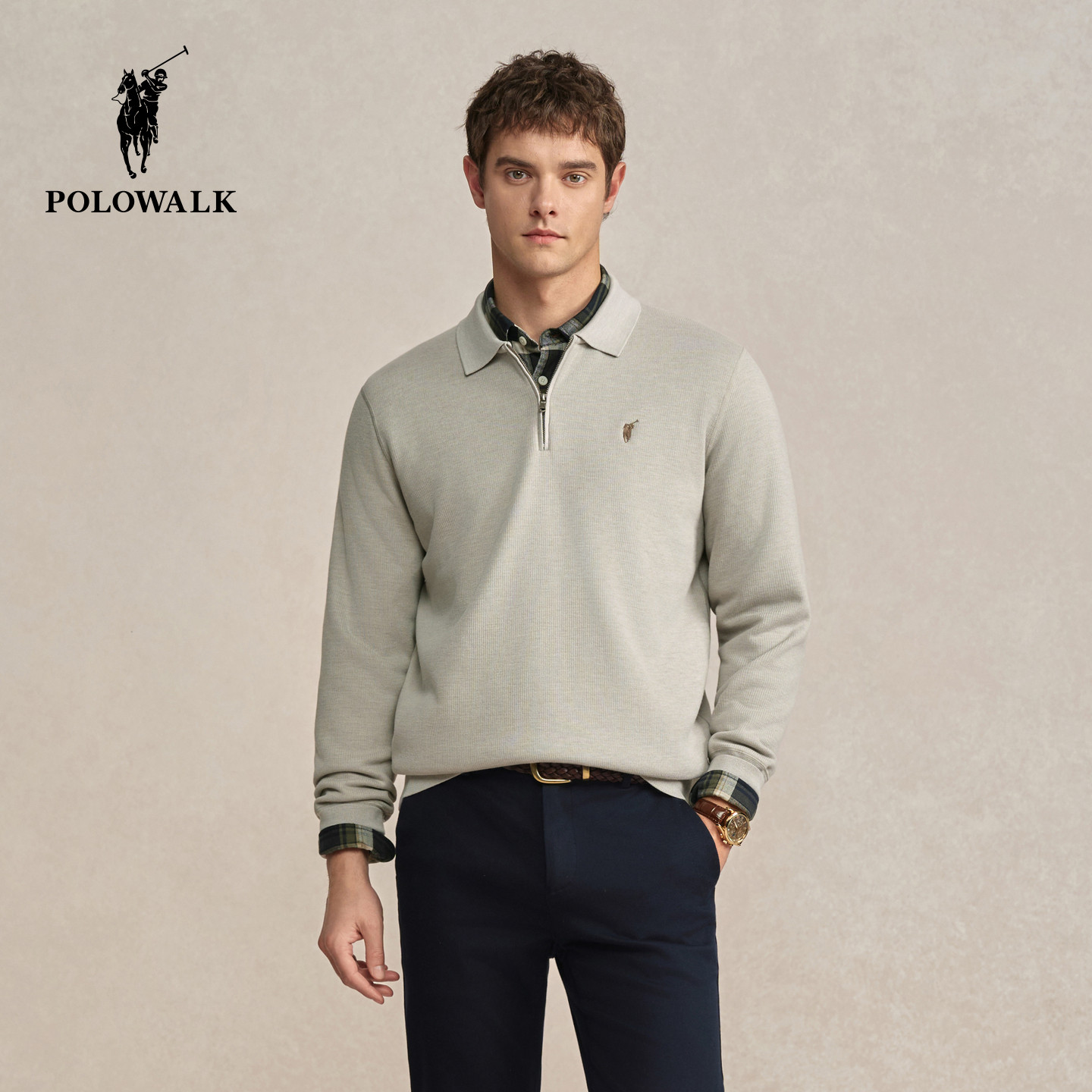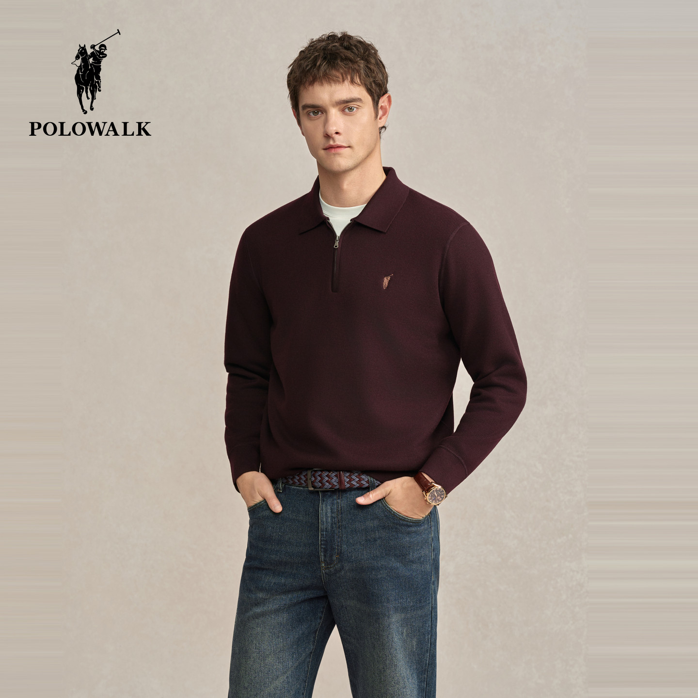 📚 POLOWALK男装2025冬季新品男式加绒翻领套头简约通勤长袖针织衫