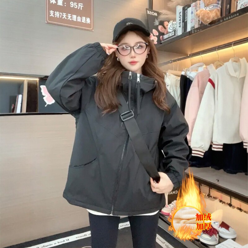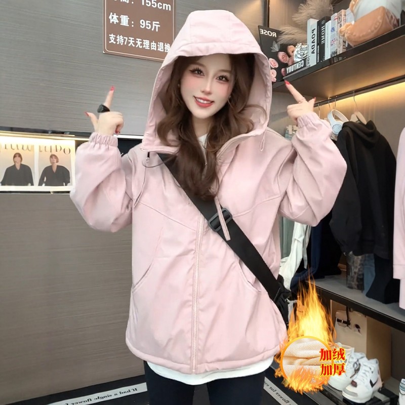 📚 加绒加厚双拉链连帽冲锋衣外套女2025冬季新款百搭小个子棉服上衣
