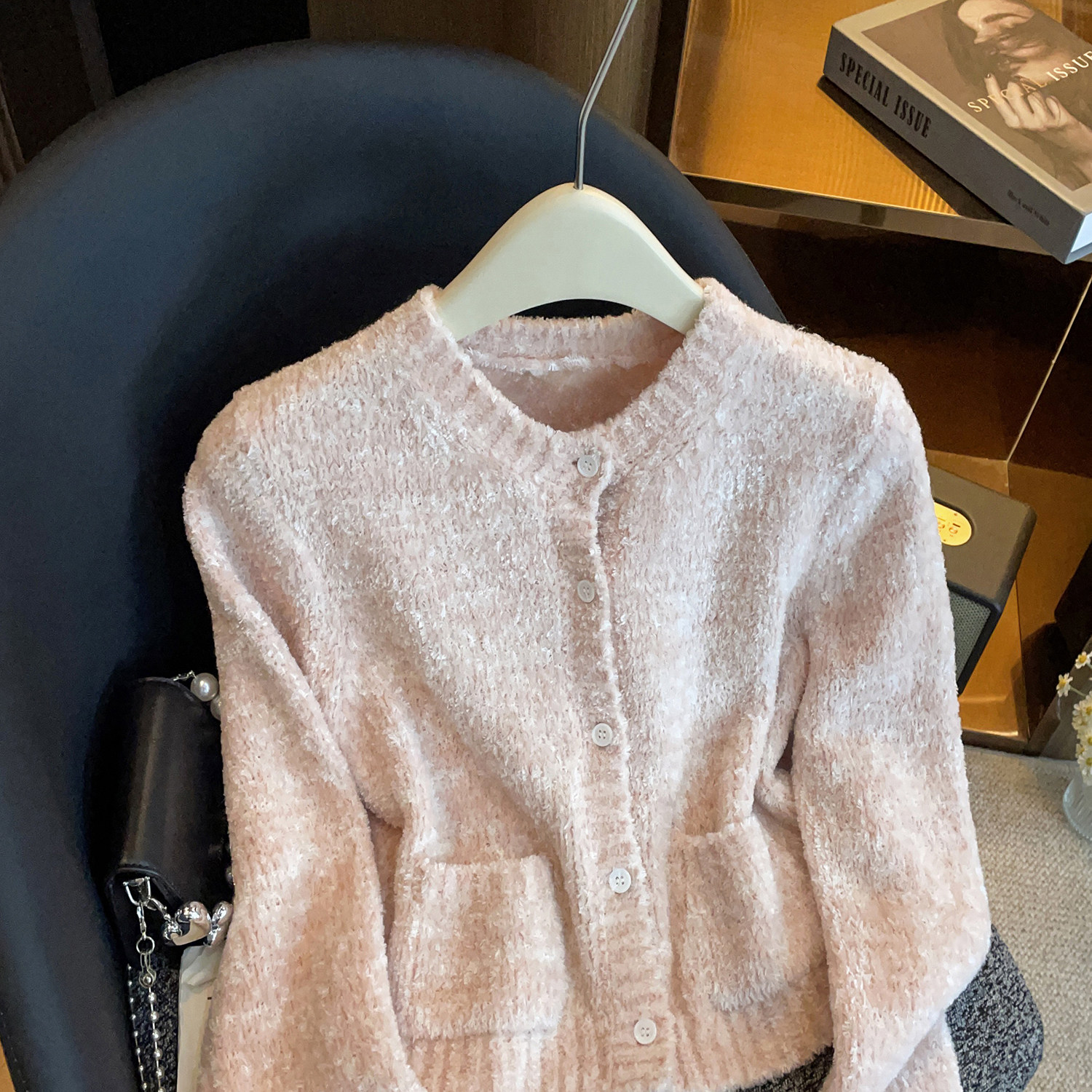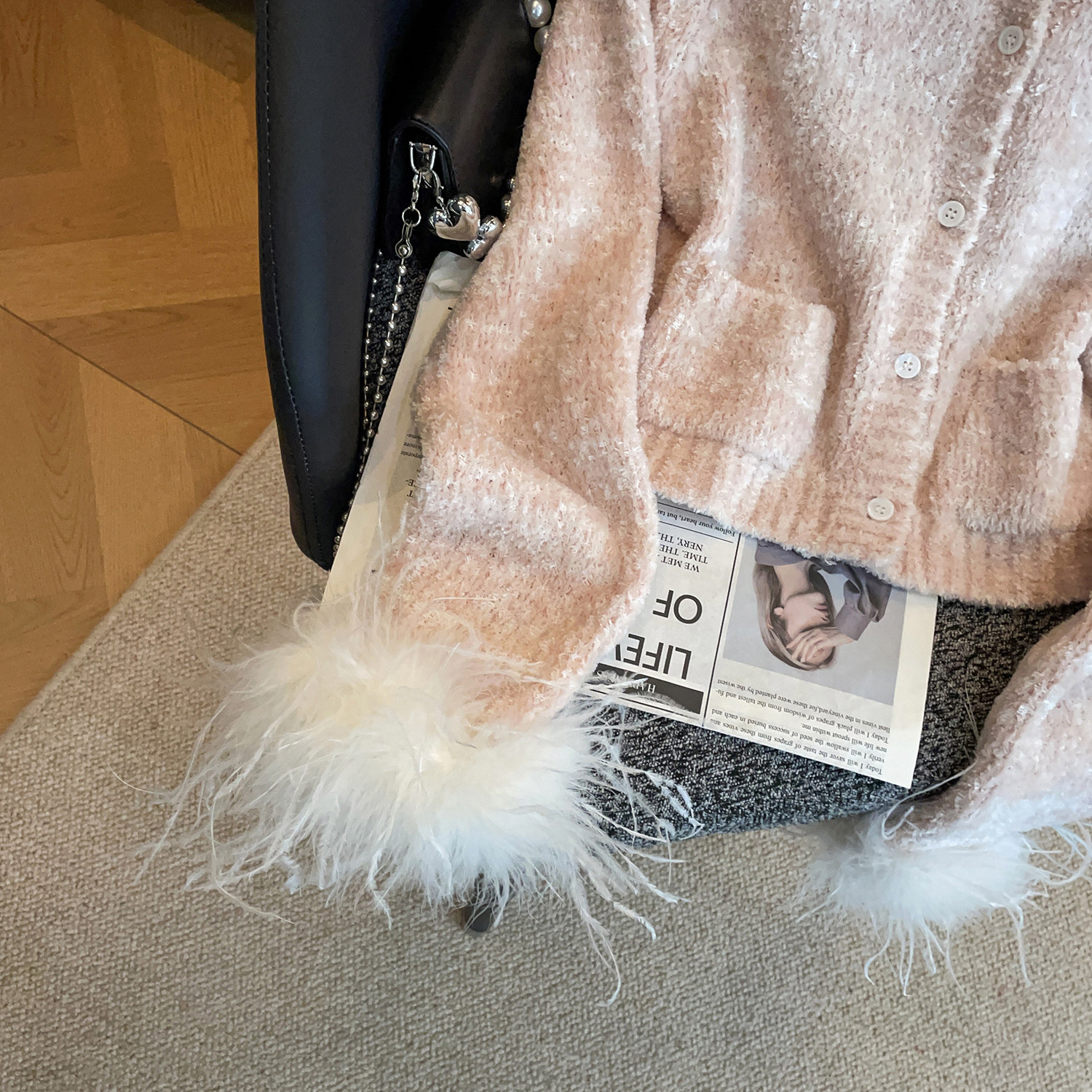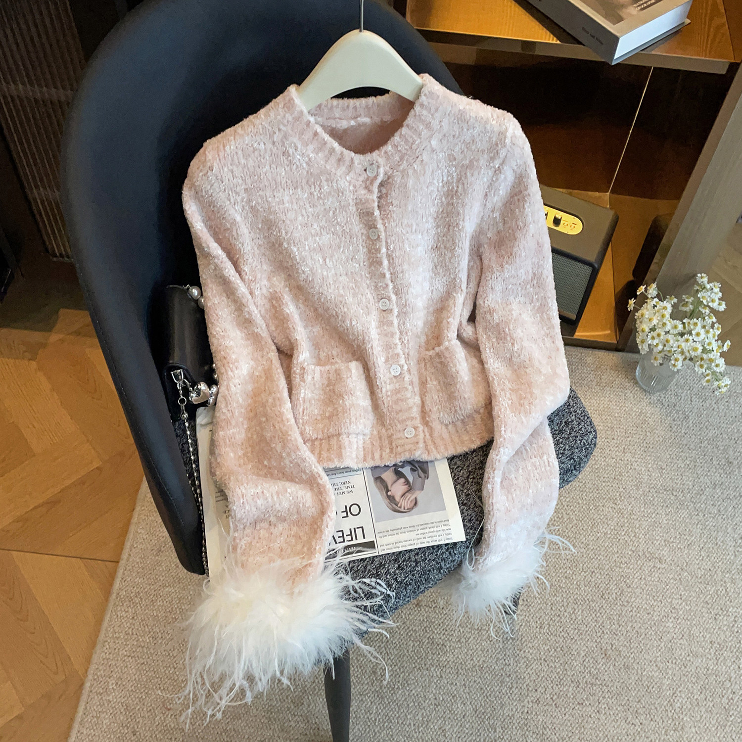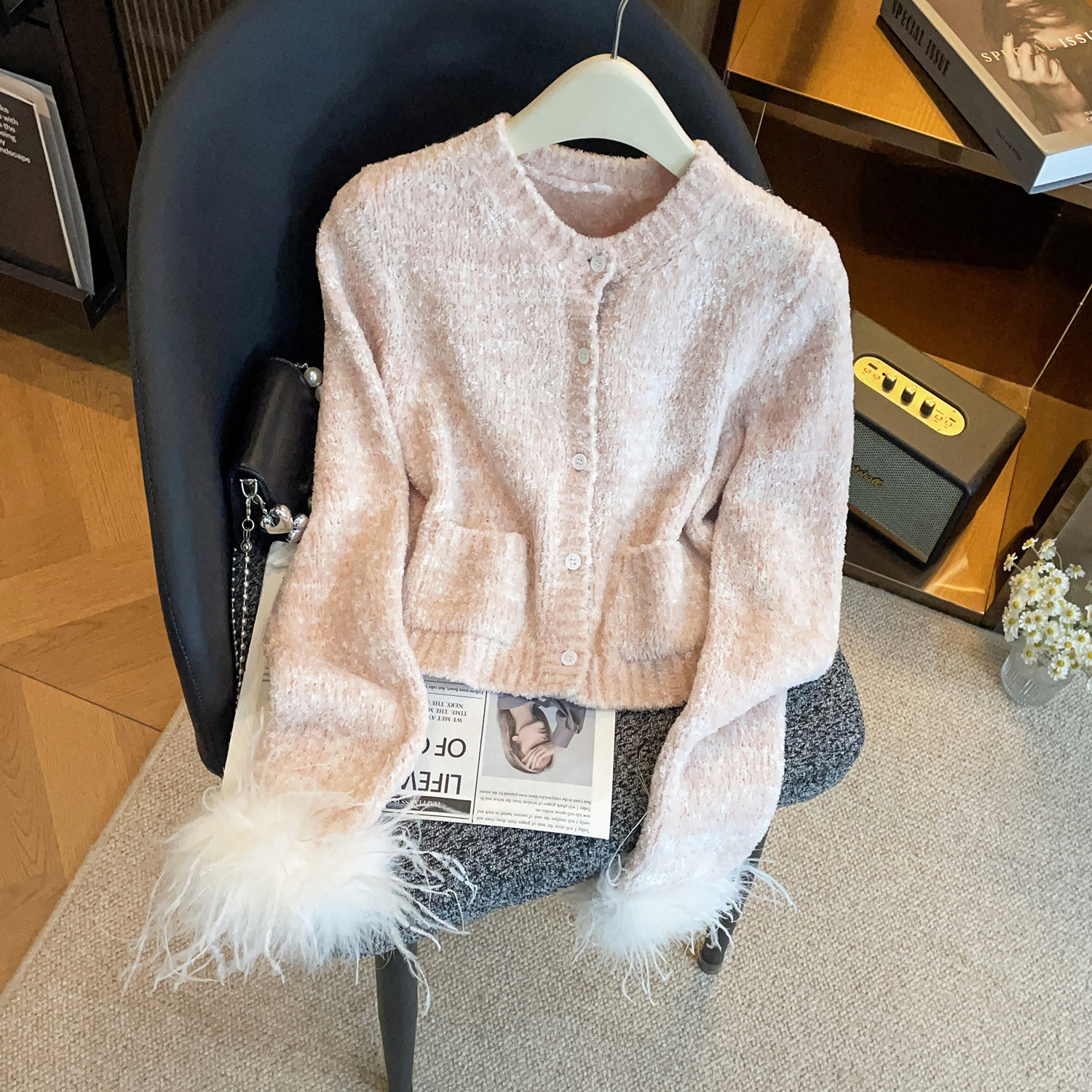 📚 深圳南油高端女装2026春季新款千金风羽毛装饰圆领纽扣针织开衫女