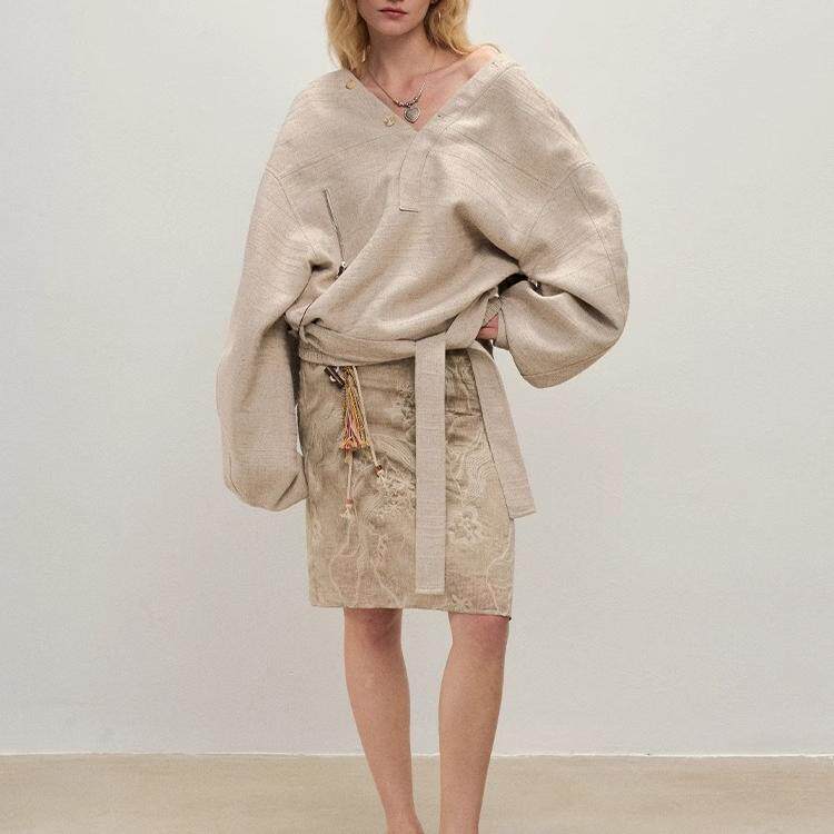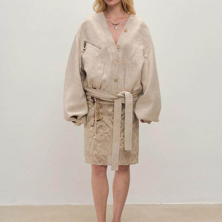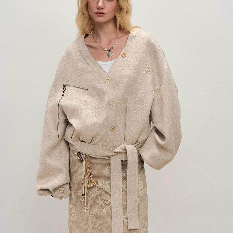 📚 【XSPACE】Dpercent|麻壳色V领亚麻混纺流线感剪裁两穿夹克外套