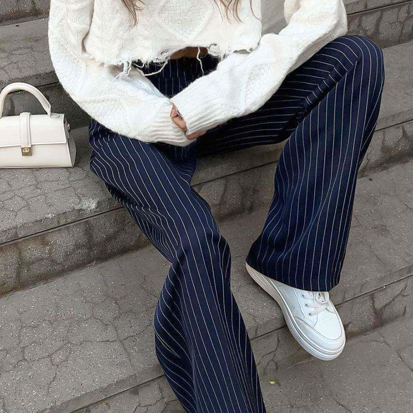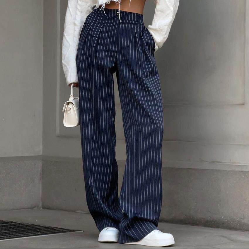 📚 Women's INS High Waist Tube Wide Leg Pants Navy Blue Stripe
