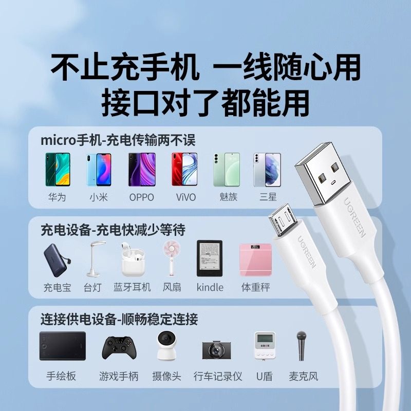 📚 绿联安卓数据线快充加长充电宝台灯蓝牙耳机小风扇microusb充电线器适用于vivo小米oppo荣耀手机2米闪充短