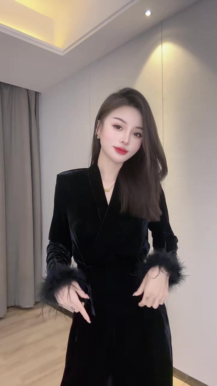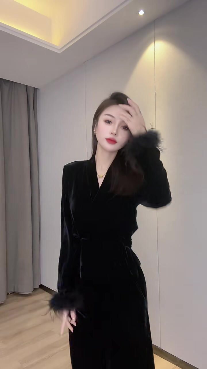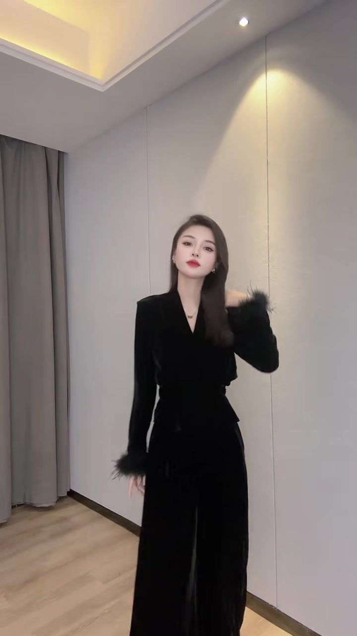 📚 网红爆款时尚洋气金丝绒套装女秋季v领拼接羽毛收腰显瘦小衫裤子