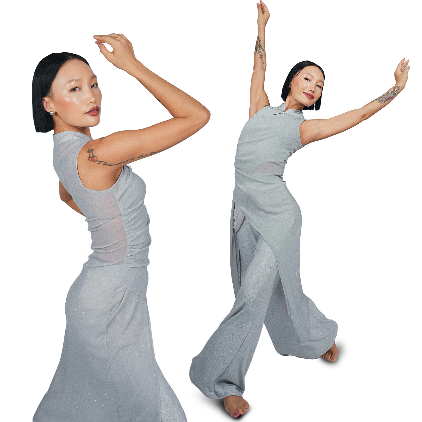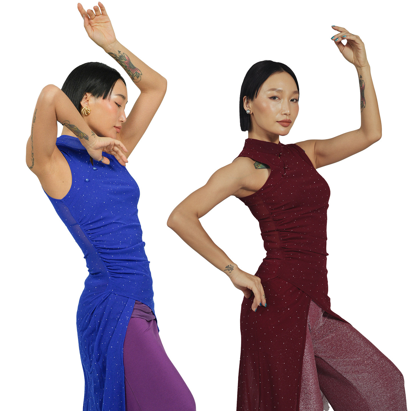 📚 王润原创SOHANA2025无袖改良旗袍质感弹力闪亮演出舞台网纱开叉裙