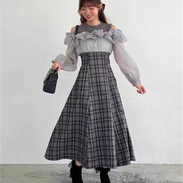 📚 majestic leg*日单人气款 薄纱荷叶边拼接长袖露肩中长款连衣裙女