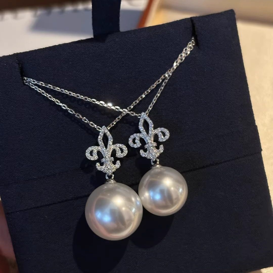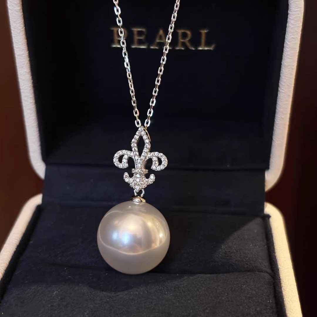 📚 法式高级感鸢尾花人造澳白14/16mm大点位珍珠吊坠项链毛衣链纯银