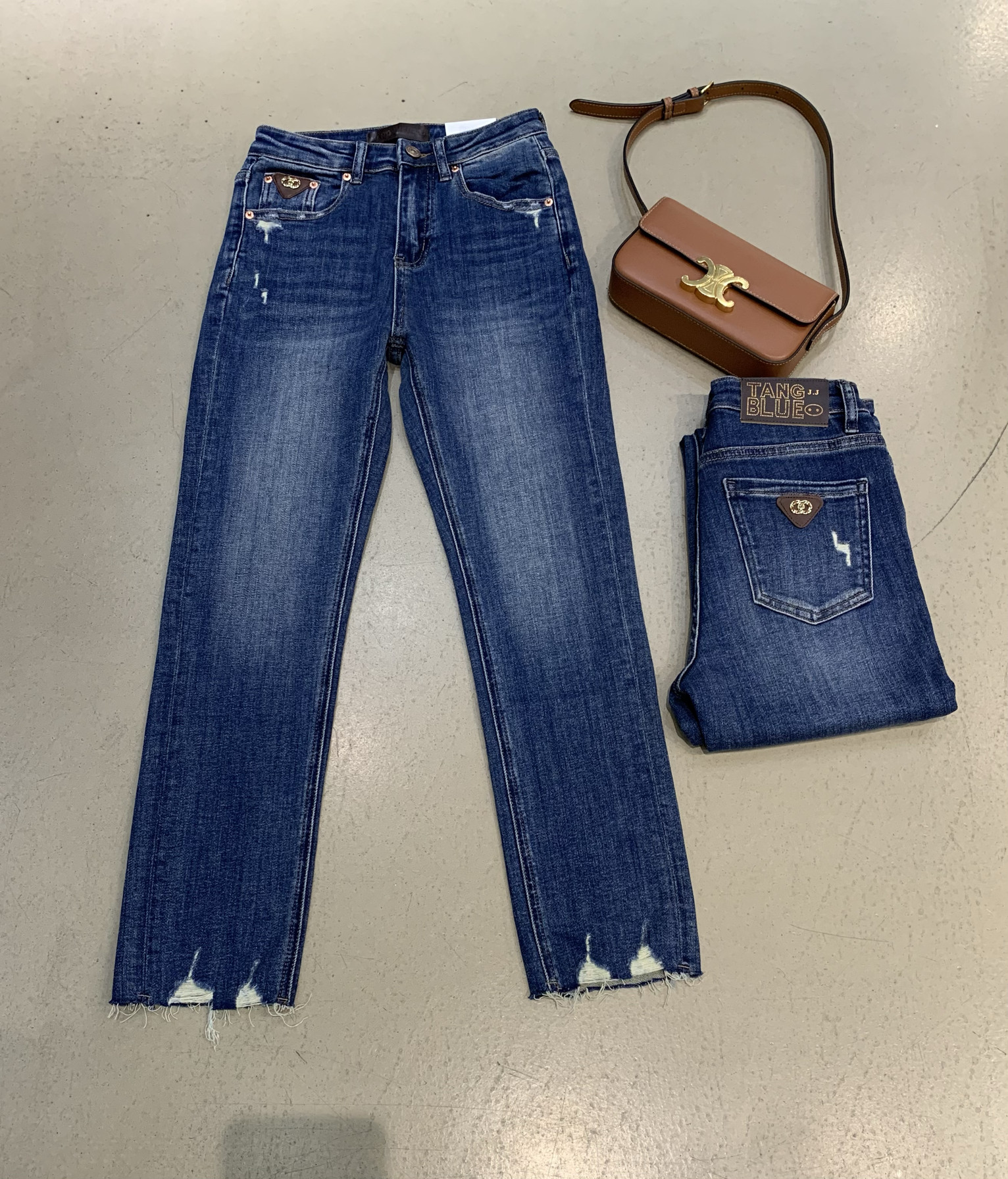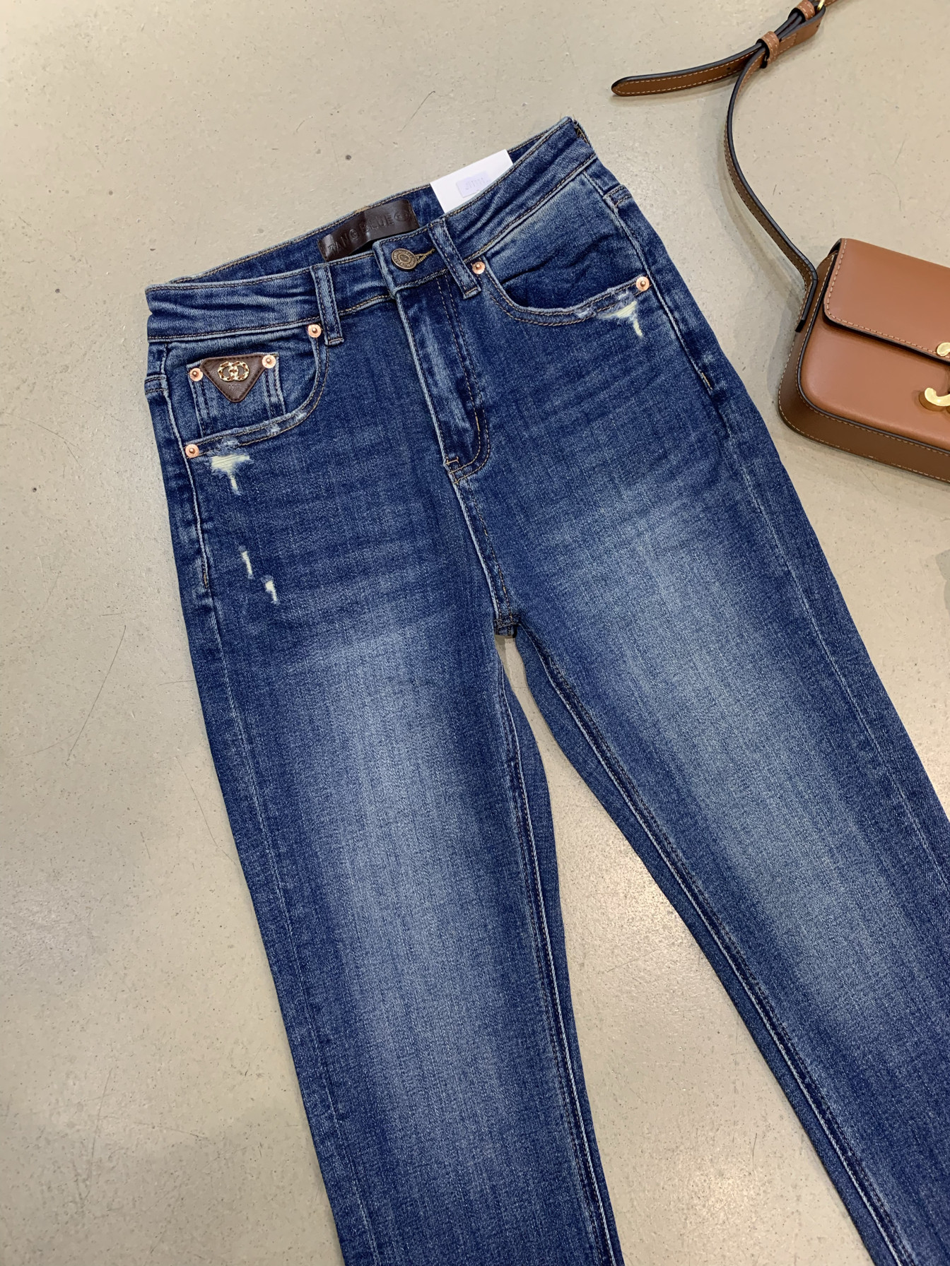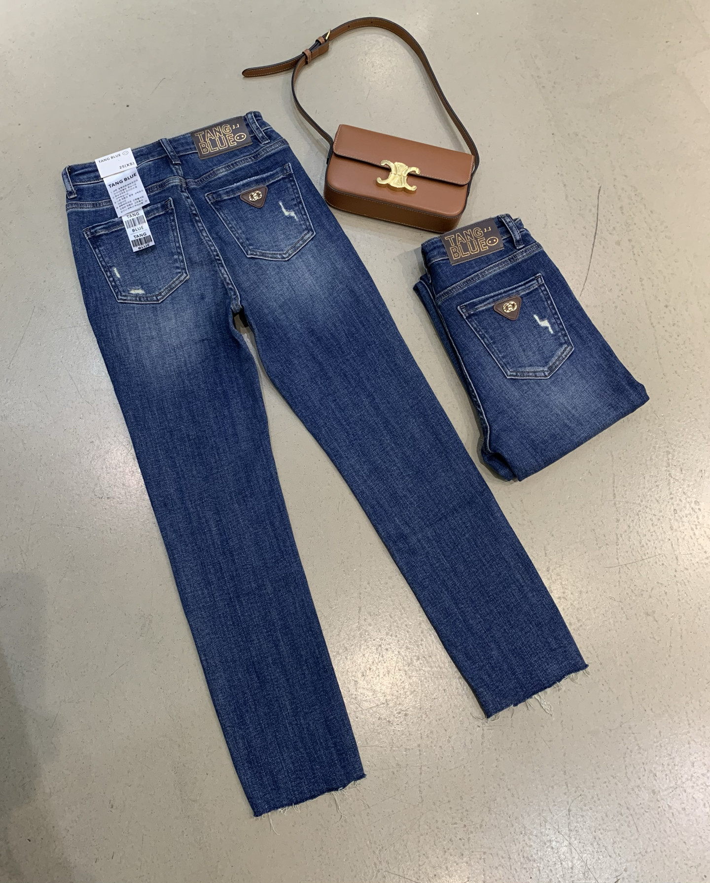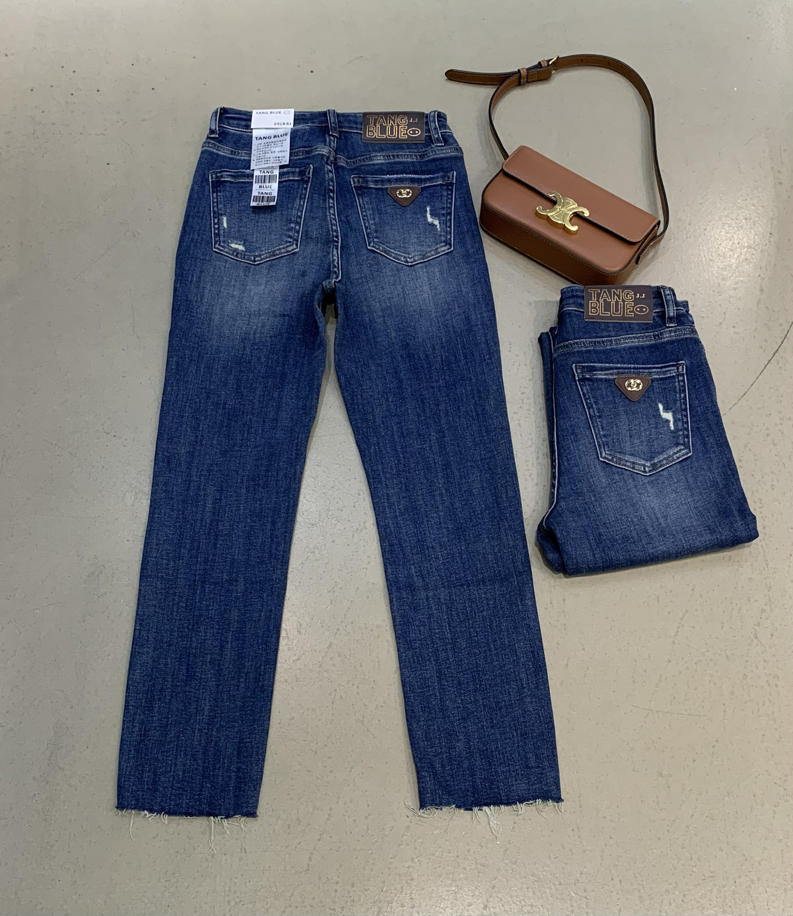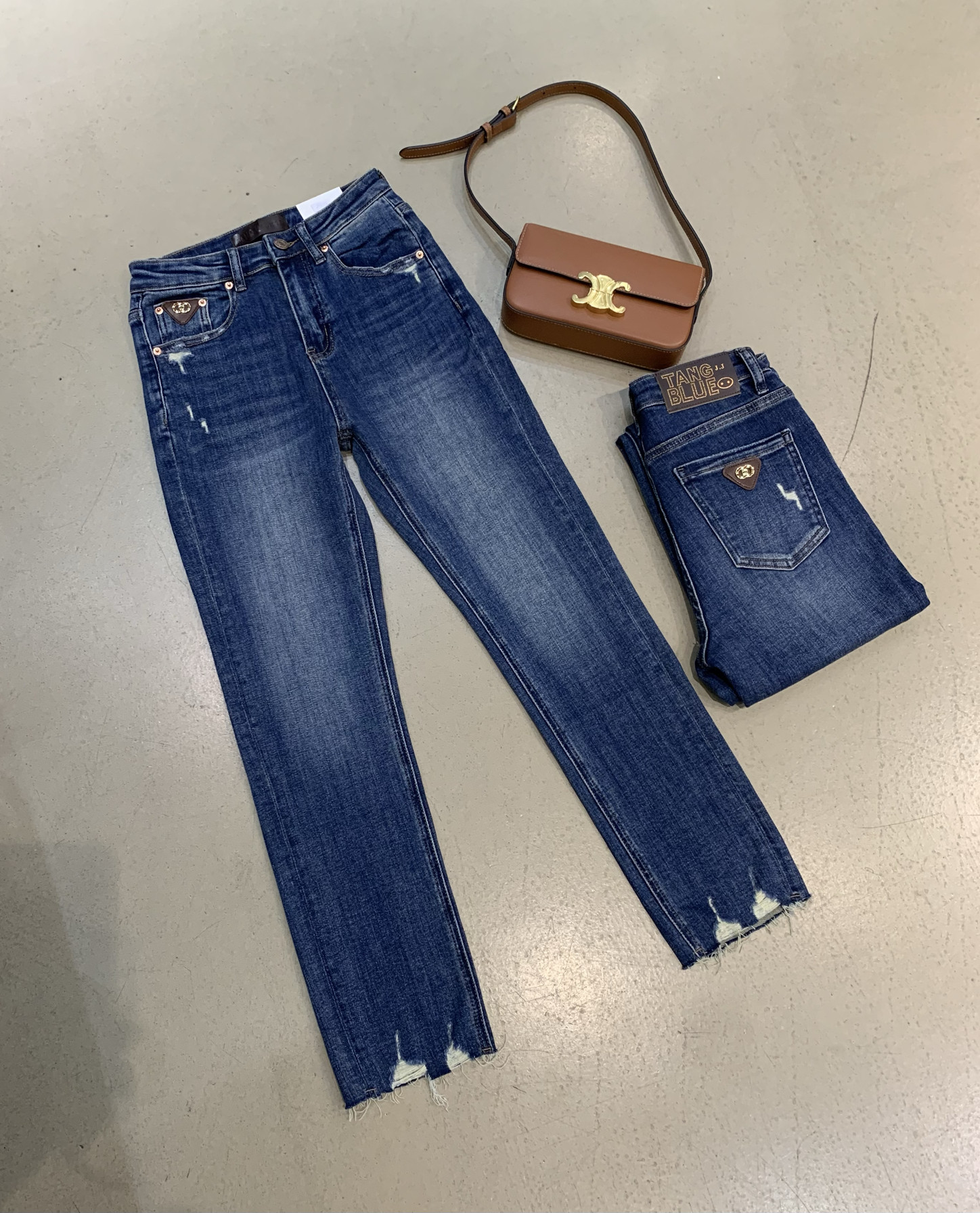 📚 韩国正品tangblue净版不破裤袋字母咖色皮九分蓝色烟管直筒牛仔裤