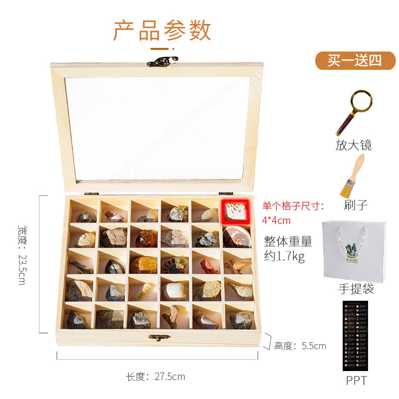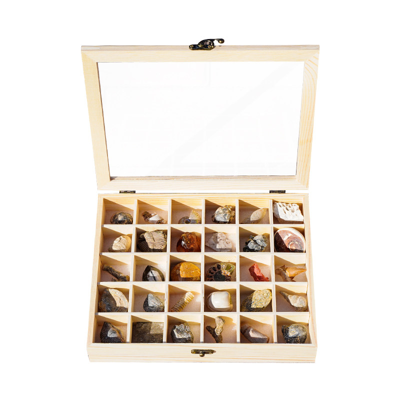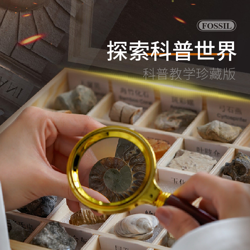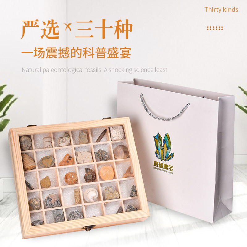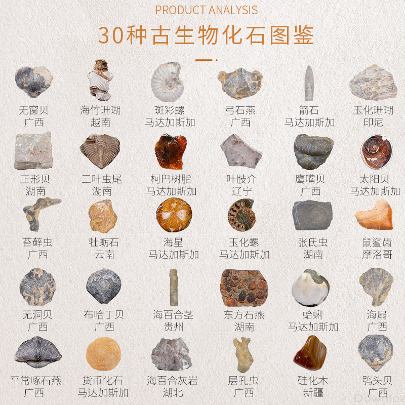 📚 天然30种化石标本套装三叶虫菊石海螺牙齿古生物矿石原石石头摆件