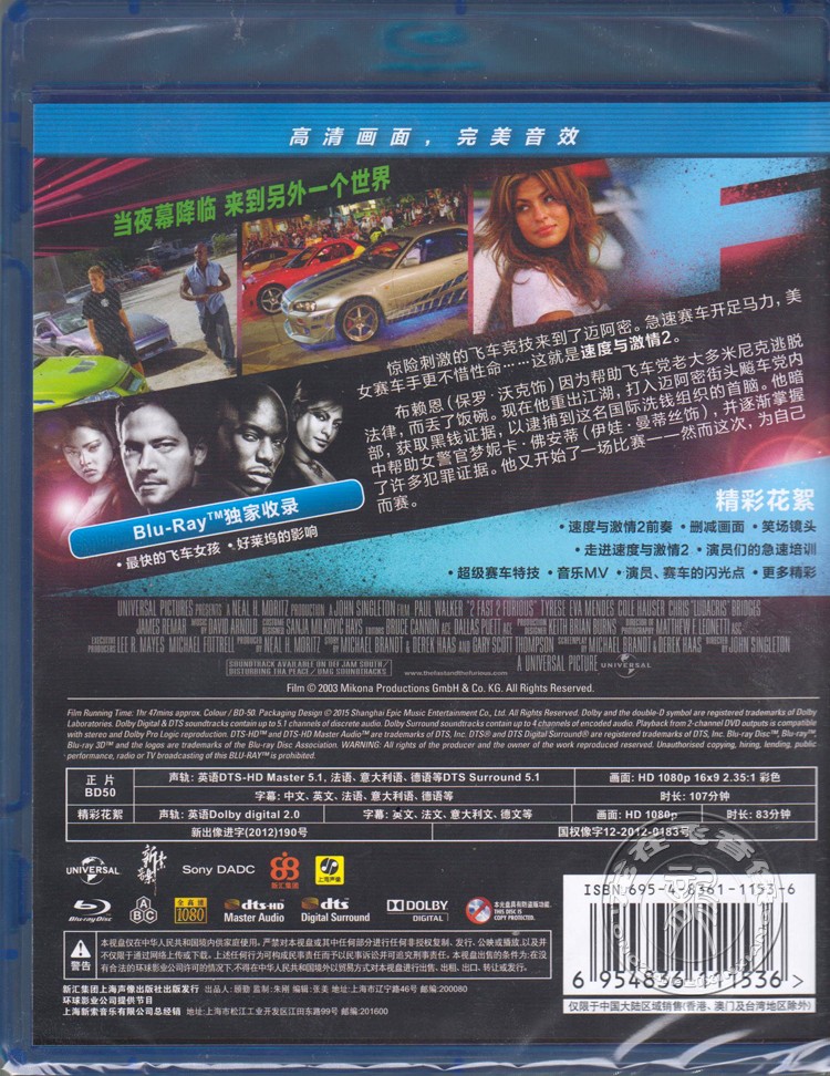 📚 正版蓝光电影 速度与激情2 BD50 保罗·沃克 飙风再起 dvd碟片
