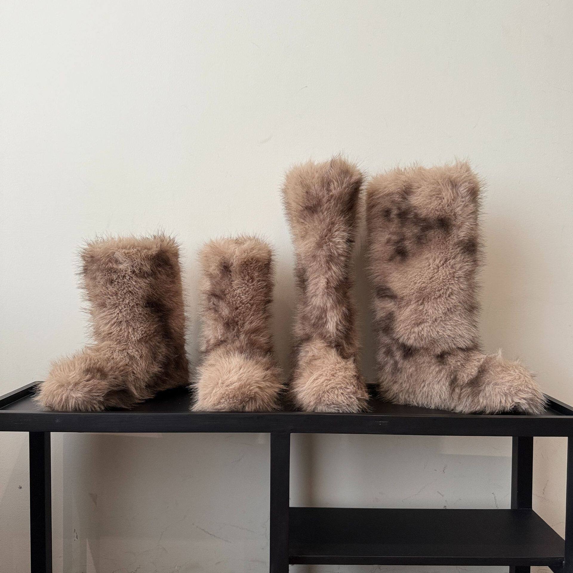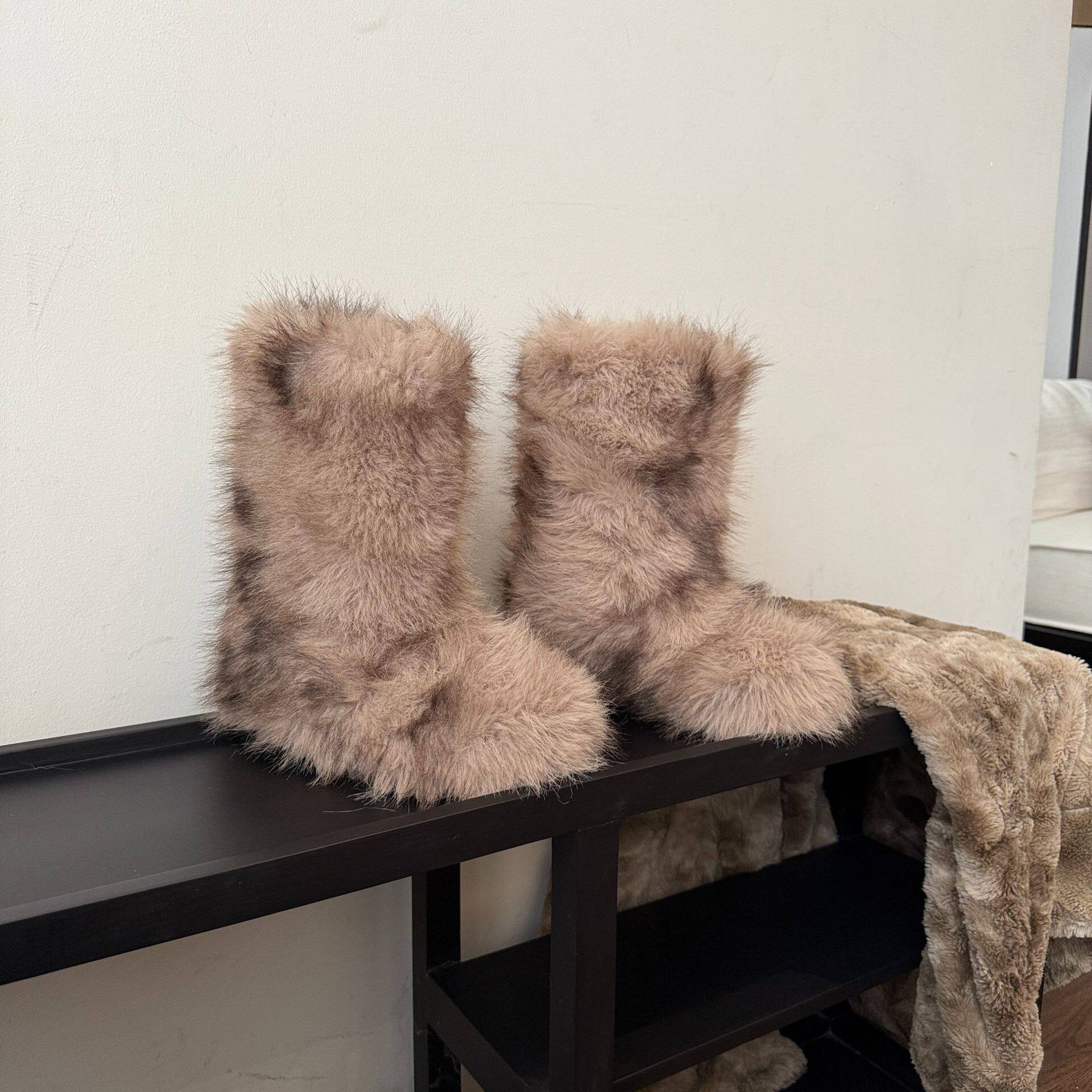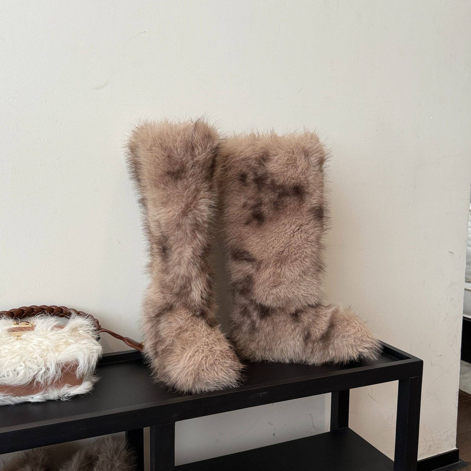 📚 拼色斑纹雪地靴女高筒毛毛靴加绒加厚丑萌厚底棉鞋毛茸茸加厚长靴