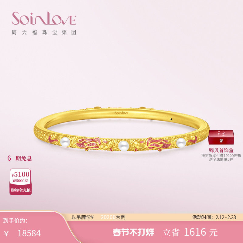 📚 周大福SOINLOVE蜜粉金十里红妆锦鲤珍珠黄金手镯女生日礼物