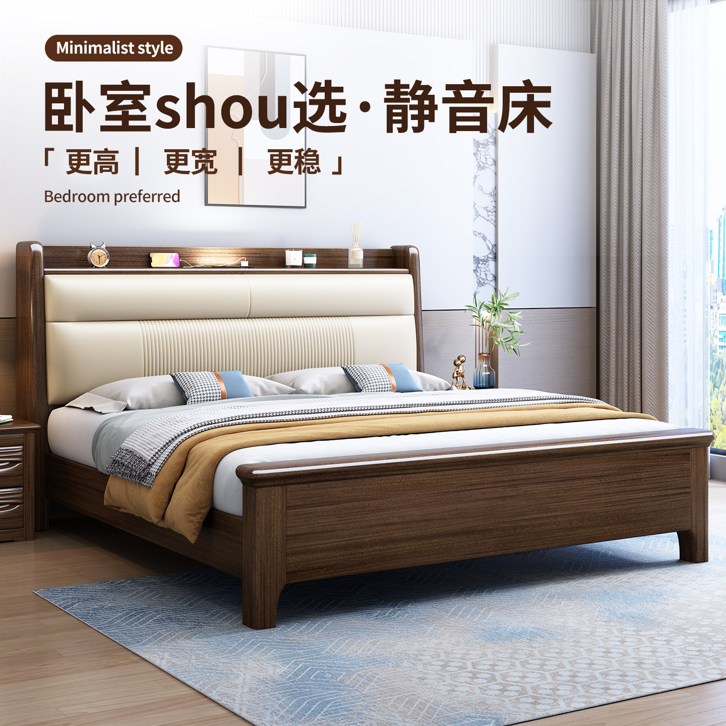 📚 胡桃木床一米八双人床现代简约床头软包靠背床广东佛山实木家具厂