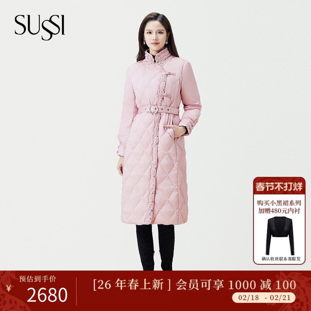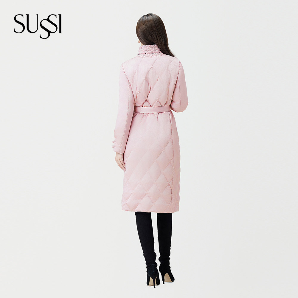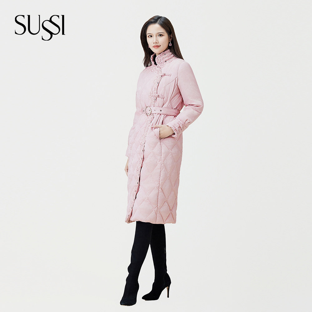 📚 SUSSI/古色冬商城同款粉色中国风立领提花盘扣腰带羽绒服女